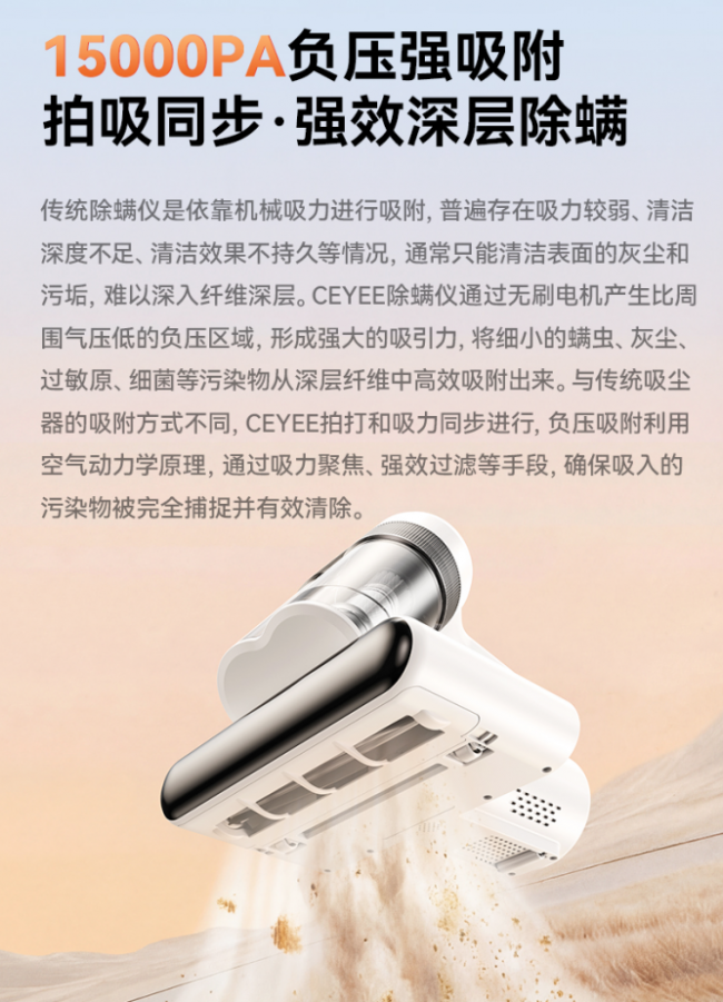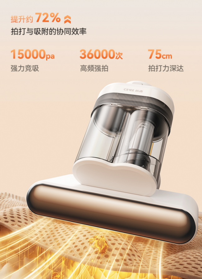 3、15000Pa飓风吸力+36000次/分钟高频拍打,深层清洁更彻底希亦V1搭载高性能无刷电机,可形成15000Pa强劲负压吸力,并配合每分钟36000次高频拍打,实现拍打与吸附同步进行,除螨率高达100%!被震出的螨虫、灰尘与过敏原能够在第一时间被吸入尘杯,避免“震出来却吸不走”的情况,大幅提升深层清洁效率。