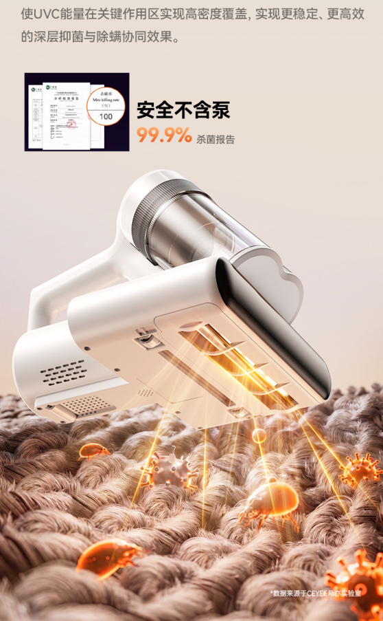 5、UVC深紫外杀菌系统,深层抑菌协同除螨针对传统除螨仪紫外灯功率不足的问题,希亦V1搭载UVC深紫外高能光源,通过定向聚焦光路设计,将紫外能量集中于核心清洁区域。在高速拍打释放螨虫与微生物的同时进行同步照射,有效破坏细菌与螨虫DNA结构,实现高达99.99%的杀菌率,在除螨的同时进一步强化深层抑菌效果。