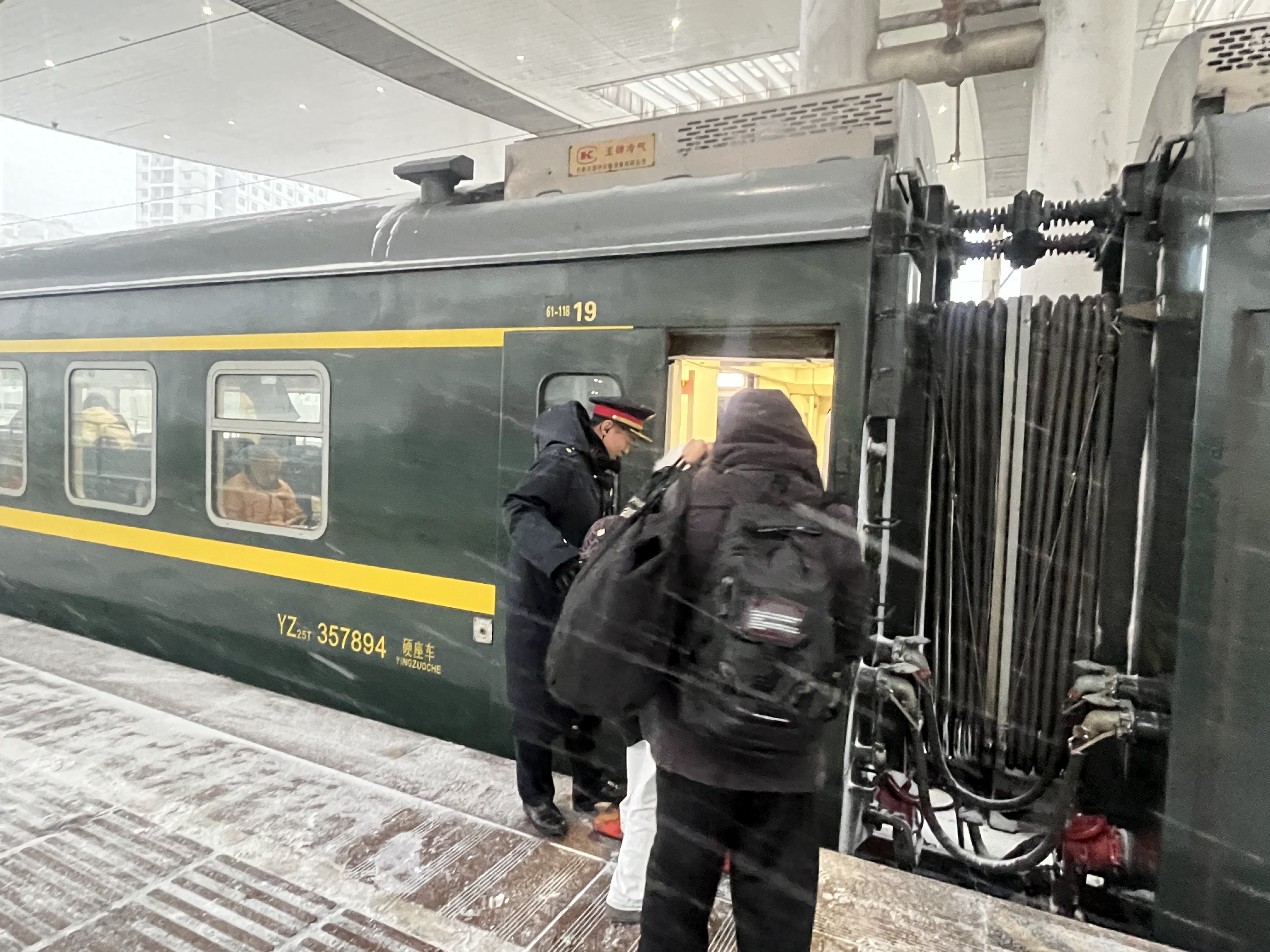 面对雪情,班组立即加强乘降组织与安全防护。在武昌、郑州等积雪较深的车站,乘务人员提前清理车门周边积雪,并在车门口引导旅客有序上下车,不断提醒“注意脚下,踩稳扶好”,有效防止拥挤与滑倒。