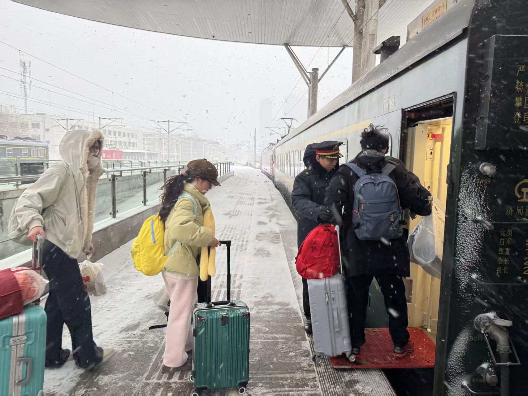 列车运行期间,乘务人员加强车厢巡视与安全宣传。每30分钟对车门、通道等关键部位进行隐患排查,并通过广播循环播放雪天出行注意事项。在旅客集中区域,乘务人员逐一进行安全叮嘱,提醒“小心地滑、切勿奔跑”。