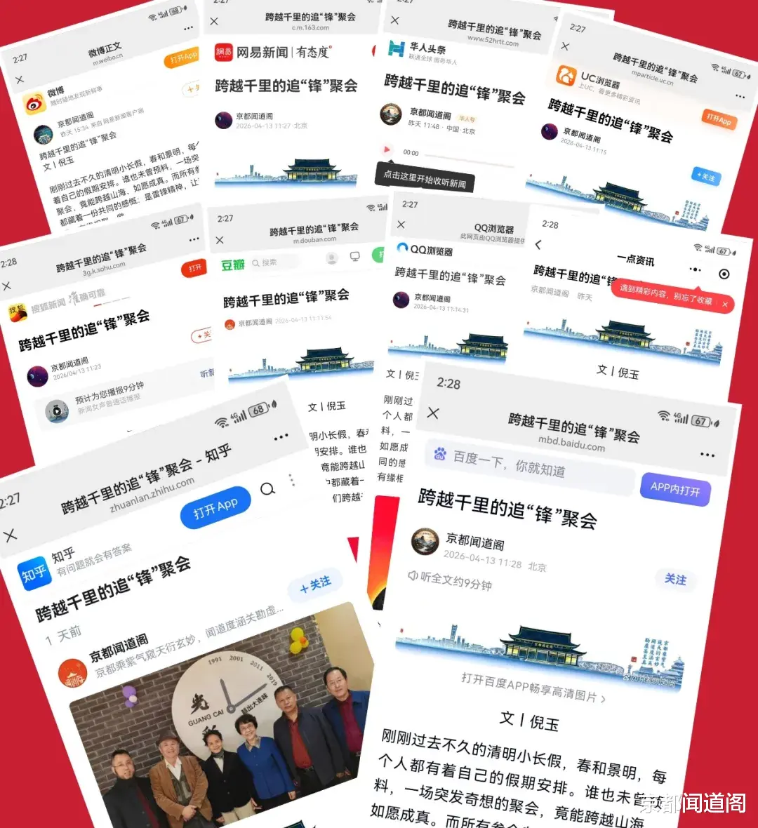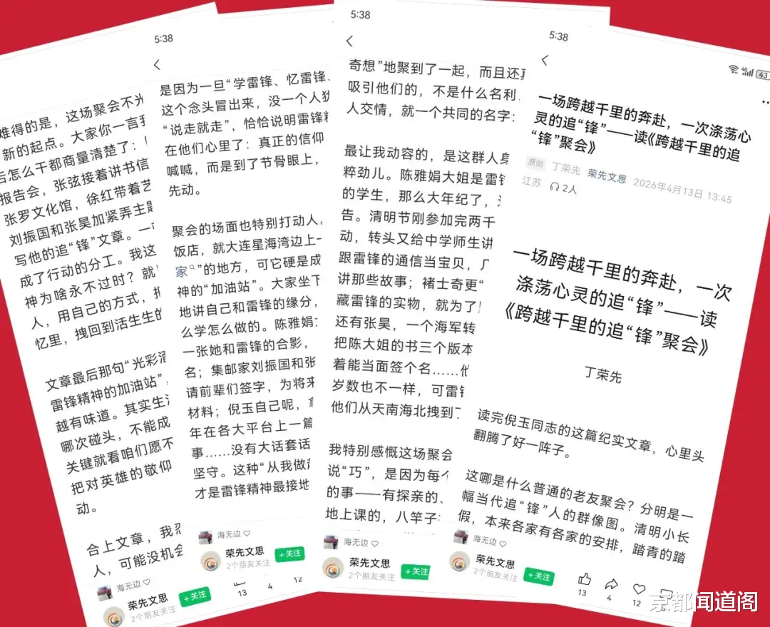 4月13日星期一,是“京都闻道阁”公众号固定的推文日子。当《跨越千里的追“锋”聚会》一文在清晨准时推送后,因为错过了最佳发稿时机,我并未对该文抱有过多期待,却意外收获了一波读者的真诚好评与共鸣。与雷锋同志有过通信、且曾亲身见过雷锋的退休高级教师张弦留言写道:“弘扬雷锋精神是光彩的事,学习雷锋,做幸福的人!”简单的一句话,既是对文章的肯定,更是对雷锋精神最朴素的践行。远在美国的读者也发来留言:“好文,为倪玉老师点赞!雷锋精神代表的是我中华民族的优良传统,我们每个人都应该坚持为传承和弘扬雷锋精神贡献自己的力量。”字里行间,满是海外游子对民族精神的眷恋与坚守。大连雷锋艺术团团长徐红的评价则更为细致:“文章有深度,宽度,高度,有思想,有内容,有层次。全面阐述雷锋传人们的坚定思想与信念。非常棒!”这些来自不同地域、不同身份读者的反馈,不仅是对这篇急就章的认可,更让我对自己一直秉持的“有感就发、无慨不言”的写作理念有了更为深刻的体悟。
