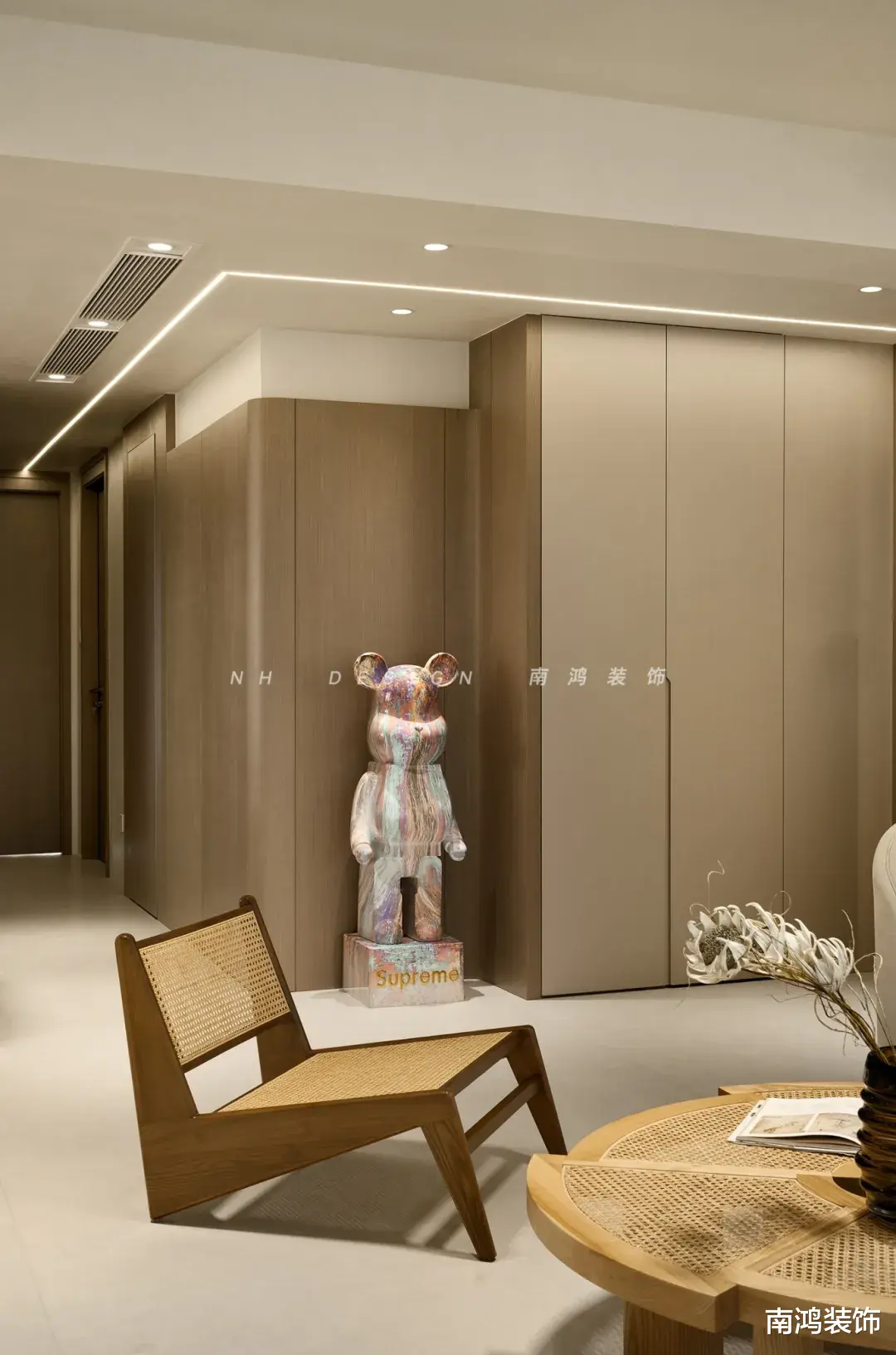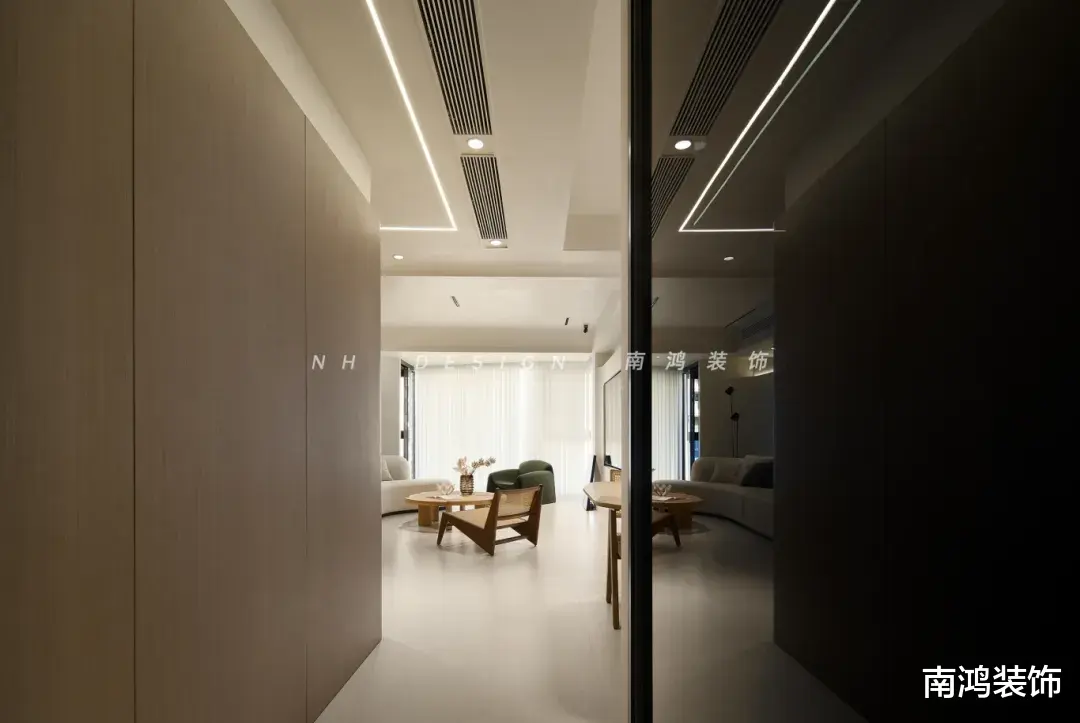 室内开放的格局令视野向走廊端无束缚延伸,通透感被放大至每一寸肌理。顶面无主灯设计勾勒点、线、面的分明层次,明与暗相互渗透,形成柔和的张力,让空间在静谧中流动出无声的节奏。