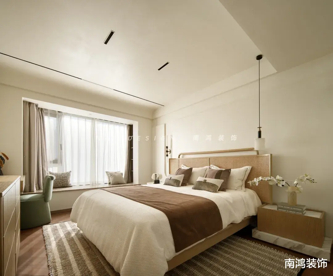 木系与藤编元素交织在一起,为空间注入充盈的自然呼吸感。背景墙留白,并以简洁又具有艺术感的造型勾勒灵动的立体光影,令这方安静的睡眠地,可以时刻与生活之美相拥。