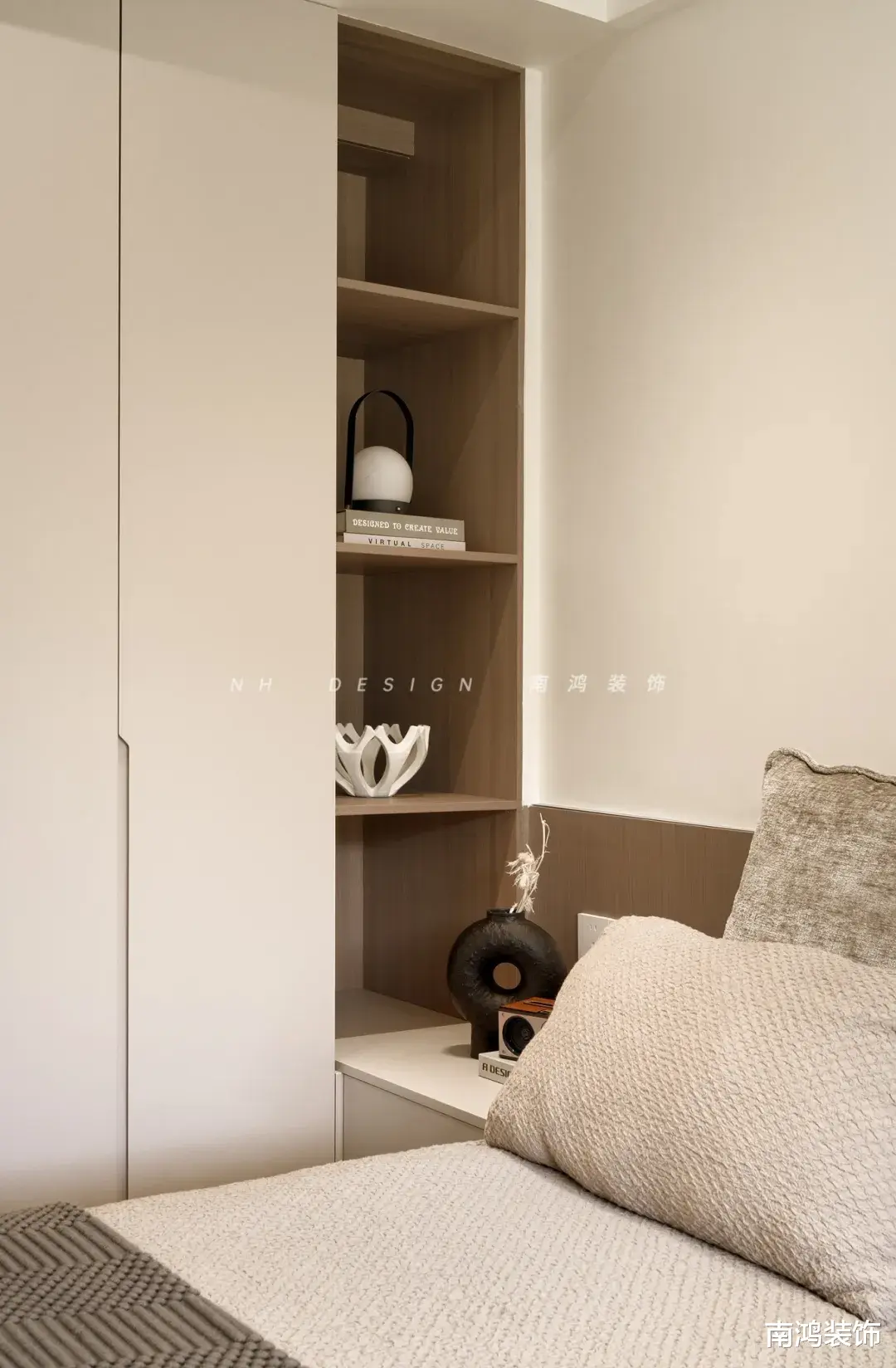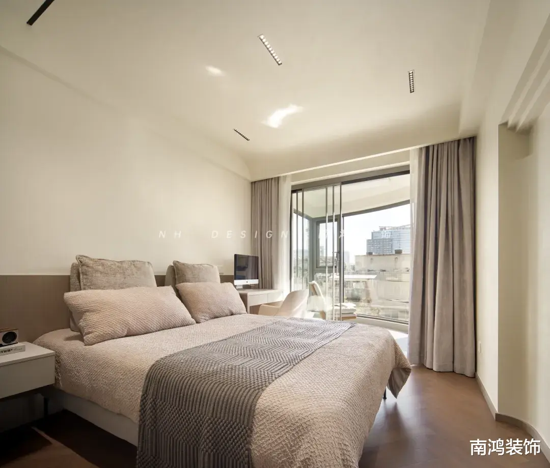 半墙木饰面塑造简约的层次与轻柔的稳定感,床头柜自衣柜延伸而出,结构衔接流畅自然。阳台的落地窗将光与景引入,只需一把休闲椅,一方独处的理想角落便顺势而成。