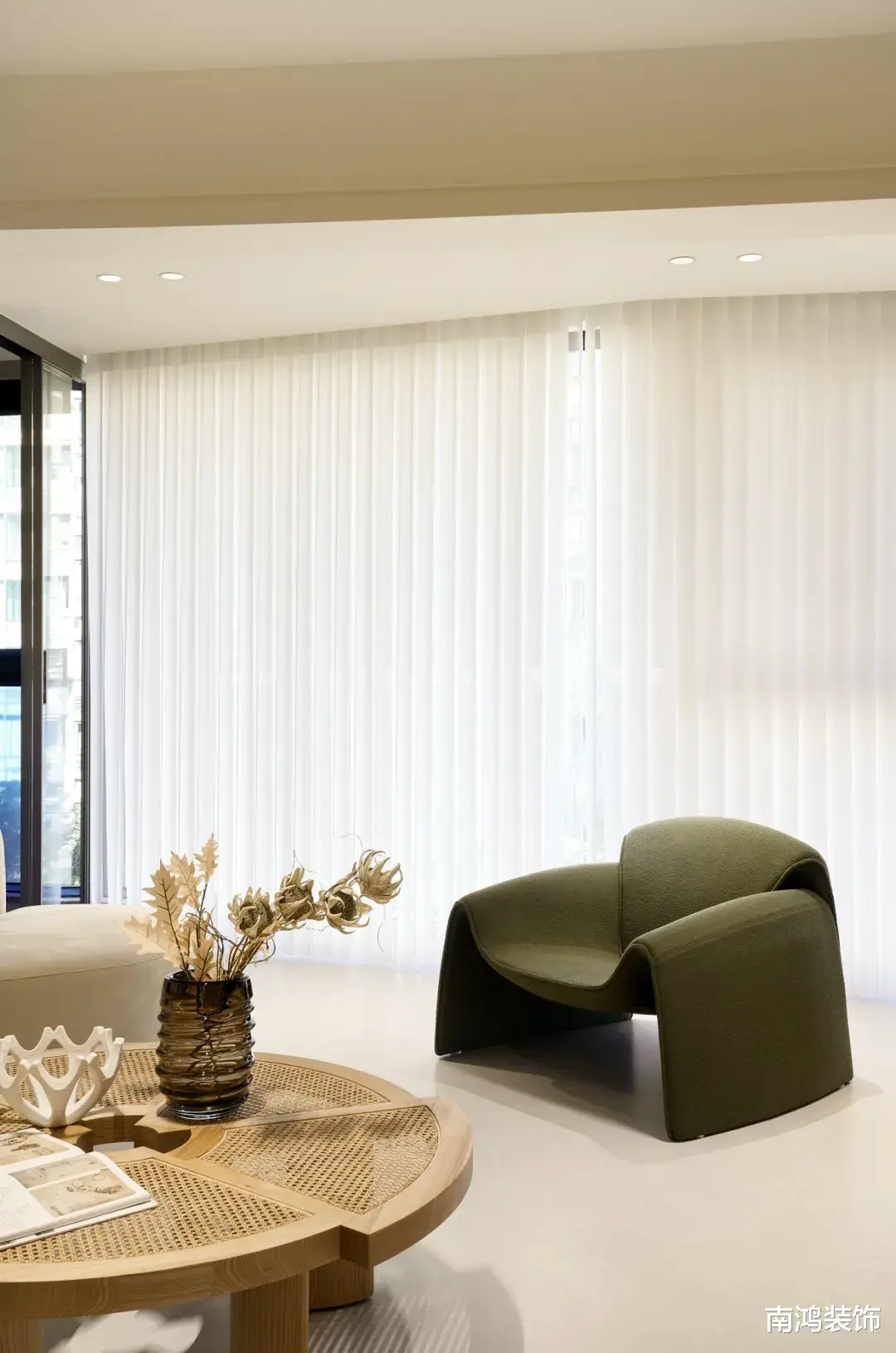 白色弧形主沙发搭配侘寂风经典藤编茶几,以及墨绿色的螃蟹椅,打造一方质感柔和、高级的休闲与会客场域。阳光透过纯洁梦幻帘,轻轻荡开幸福的光晕,让心不由自主安定下来。
