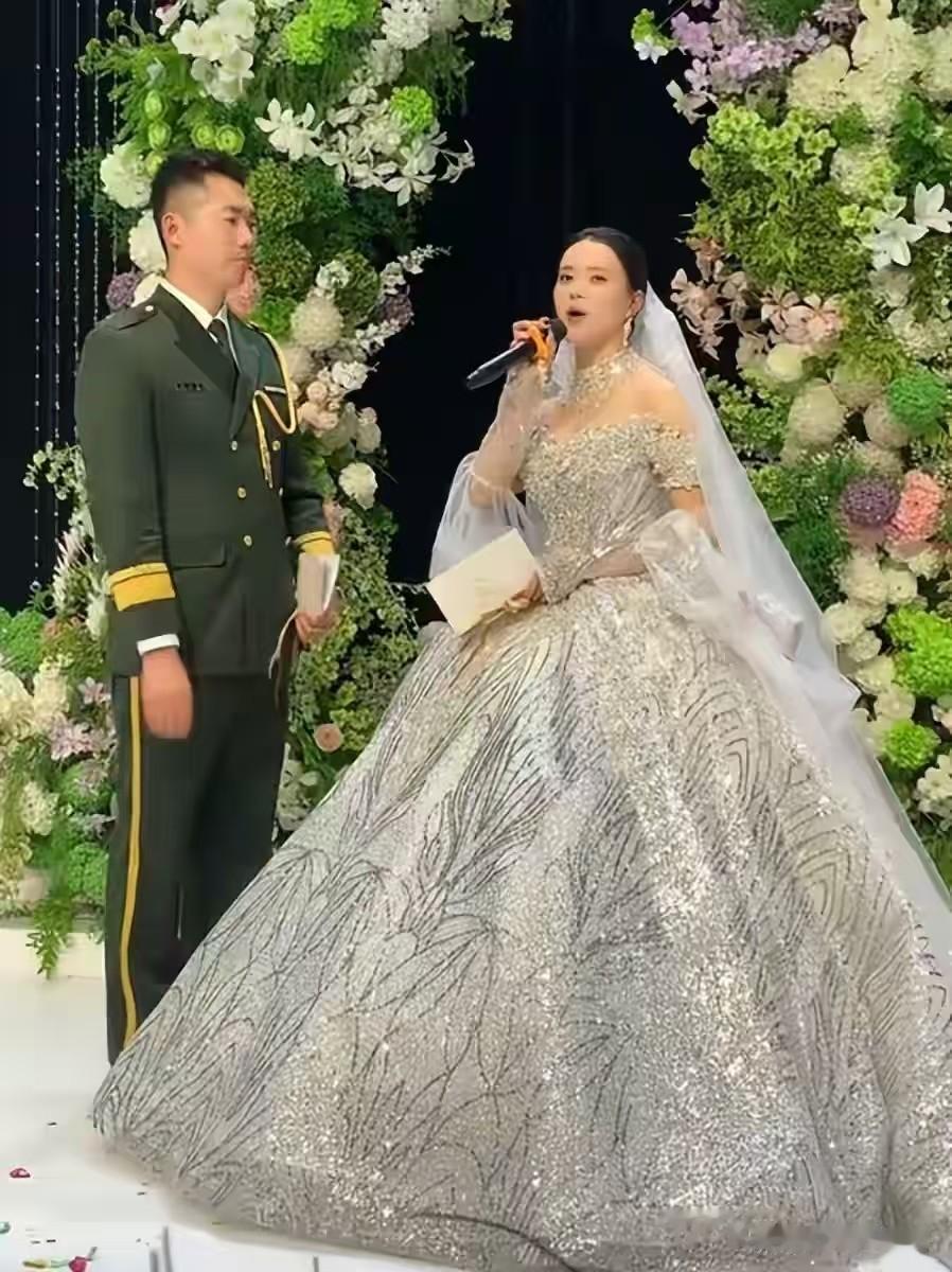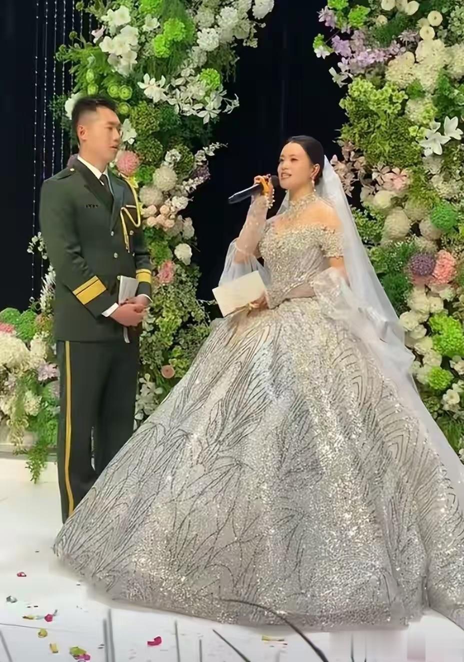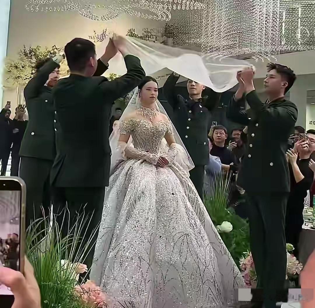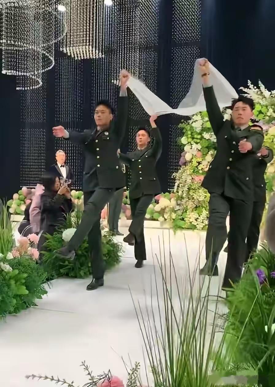 最精彩的环节要数给新娘盖头纱了,张自轩国旗队的战友们用最高规格为新娘盖上头纱。四名战友穿着没有军衔的军装,托起头纱的四个角,正步行进来到新娘近前,为她盖上头纱,现场响起热烈的掌声。