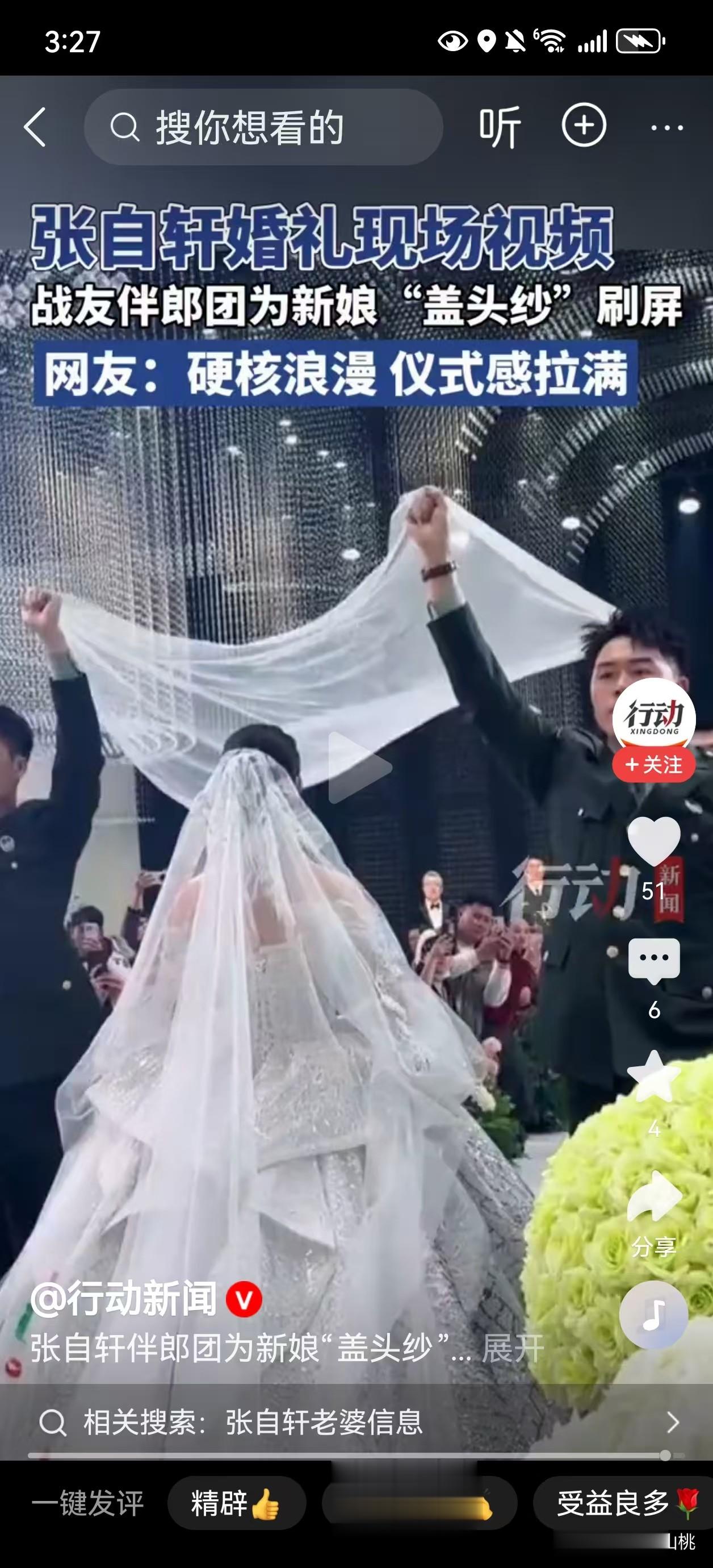 婚礼现场非常热闹,去了不少张自轩的战友,女方的父母、妹妹还有其他亲属;网上也是祝福不断,很多自媒体主播与网友纷纷送上美好的祝福。