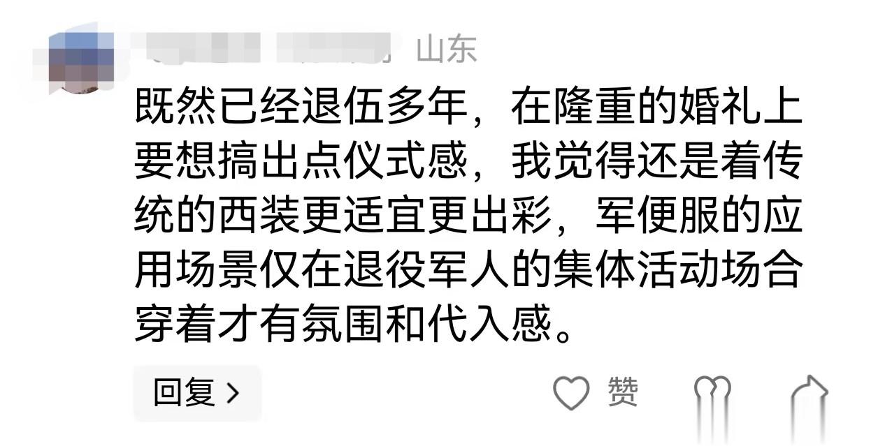 也有网友认为,既然已经退伍多年,在隆重的婚礼上要想搞出点仪式感,还是着传统的西装很适宜更出彩,军便服的应用场景仅在退役军人的集体活动场合穿着才有氛围和代入感。