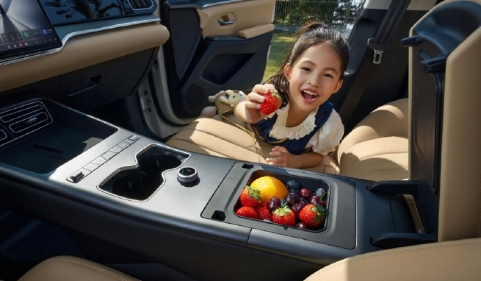 座舱配置直接瞄准家庭需求:新增的星河米、翠峰绿低饱和车身色,温柔耐看;车内装了一体式冷暖冰箱、前排座椅通风加热、带遮阳帘的全景天窗,还有31色氛围灯,冷热饮、四季温度、开阔视野、温馨灯光全都有,像把客厅搬进车里,通勤、出游都轻松。