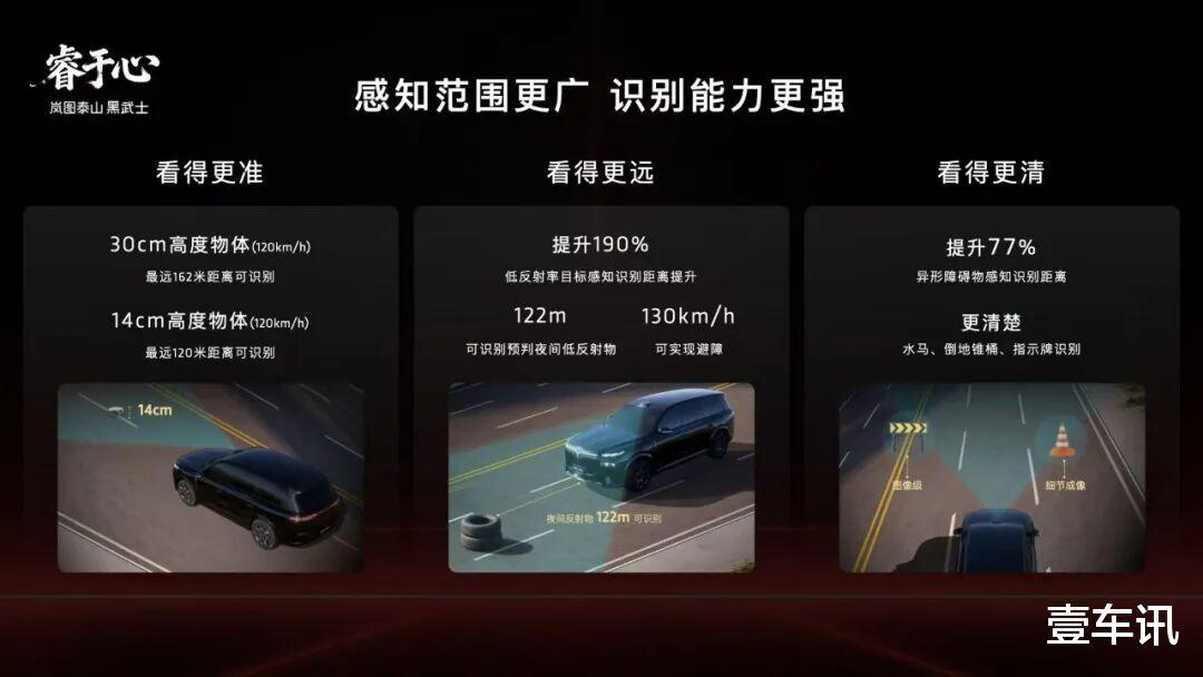 感知硬件是实现L3有条件自动驾驶的基础,岚图与华为优势互补,在高阶智驾系统与高精度感知硬件等方面展开深度合作,华为顶尖技术+岚图全维实力兜底,构筑价值壁垒,真正实现从“特定路况”到“全场景”通用,带来全天候的安稳与从容。岚图泰山Ultra版搭载行业最强四激光雷达矩阵,包含1颗行业量产最高规格的896线双光路图像级激光雷达,相比传统192线激光雷达,896线双光路图像级激光雷达实现了断层领先,针对30cm高度障碍物最远识别距离高达162米,针对14cm小目标也能实现120米远距识别,真正实现了从“点云级”到“图像级”的跨越,是目前行业感知硬件的“天花板”。除四激光雷达外,岚图泰山Ultra版还配备丰富的融合感知传感器,包括高清摄像头、毫米波雷达、超声波雷达等共计34颗智慧传感器。多传感器融合的感知体系,帮助岚图泰山Ultra版搭建起全场景无死角的感知网络。