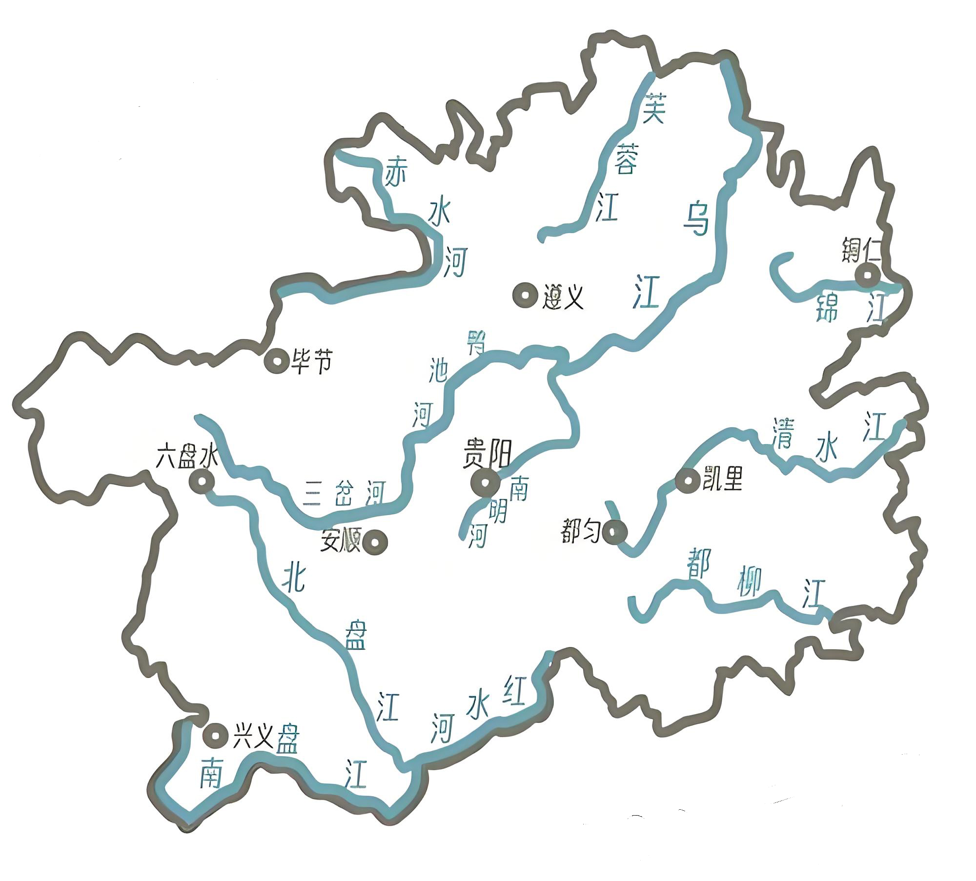 贵州。东西走向的苗岭将贵州水系一分为二,北部属长江水系,流域面积占全省65.7%,其中乌江是贵州第一大河,流域面积占全省37.9%;南部为珠江水系,流域面积占全省面积34.3%,以南、北盘江及汇合后的红水河为骨干。