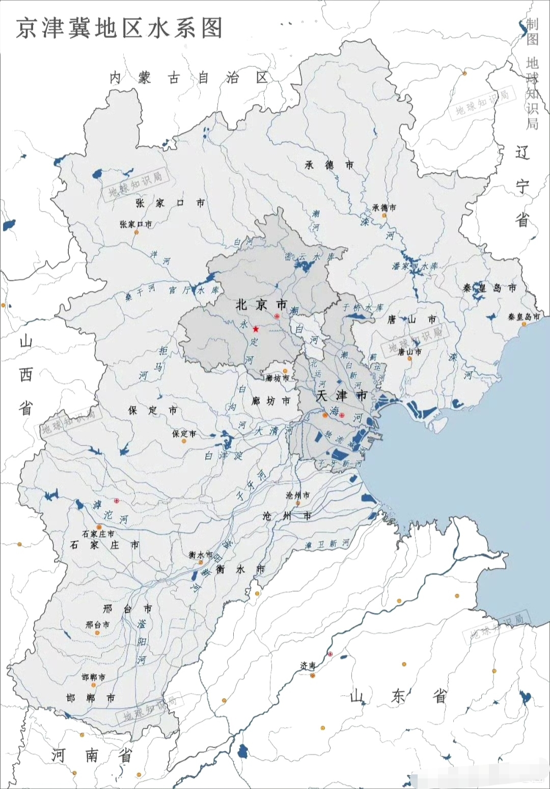 北京。全市主要河流均属海河水系,包括永定河、潮白河、北运河、大清河和蓟运河五大水系。主要河流是永定河,其流域面积仅占北京市总面积的18.9%,但被誉为北京的母亲河——北京小平原正是由其冲积作用形成。
