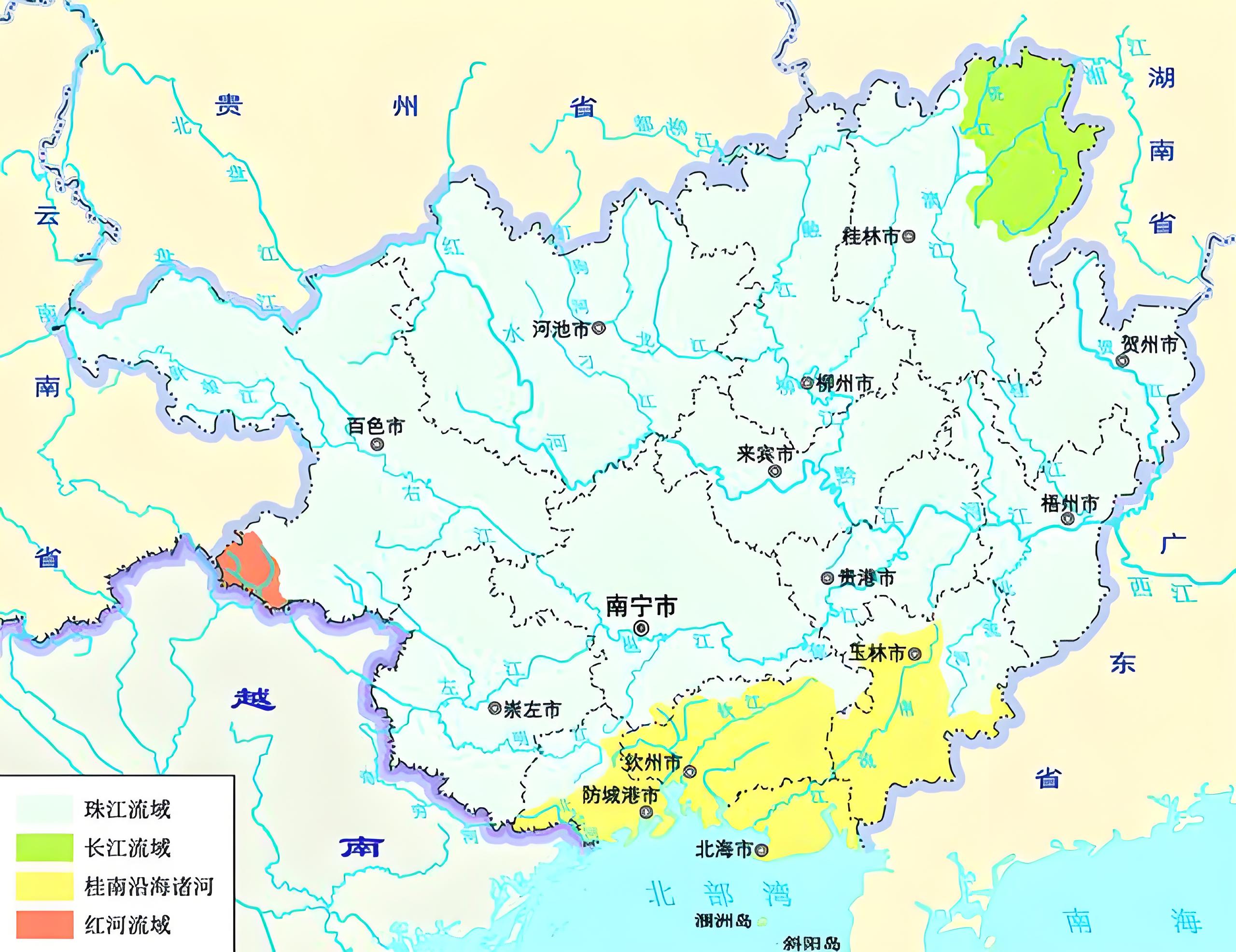 广西。全境面积的85.4%属于珠江流域西江水系。以西江水系为核心,涵盖红水河、郁江、柳江、桂江、贺江等支流,构成了广西充沛的水网。另有南流江、北仑河等独流入海河流。