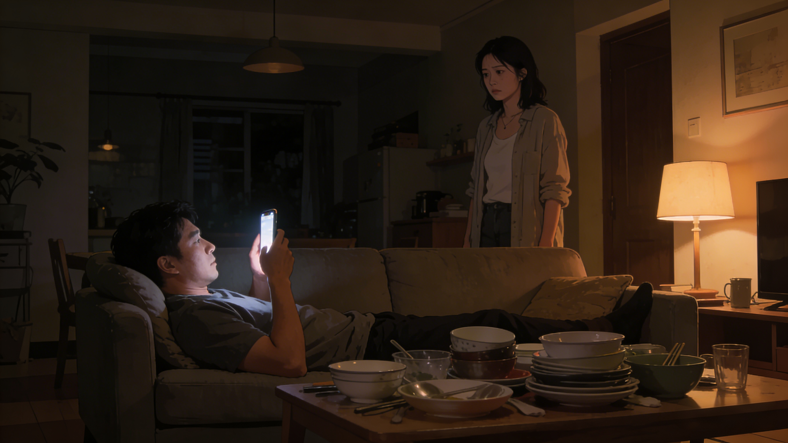 吃完饭后,她要给孩子辅导功课,看到老公瘫在沙发上开始刷手机,她轻声提醒:“碗你洗一下。”
