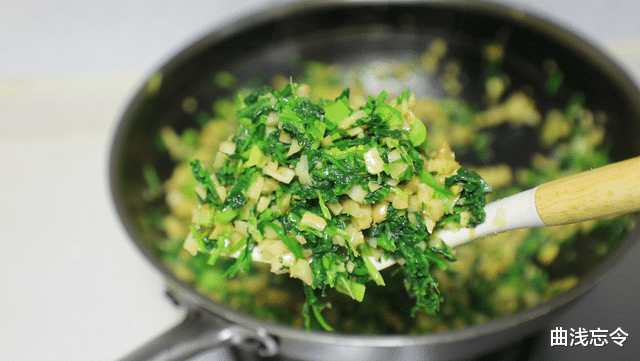 3、熬料油:锅中倒入适量油,加葱姜花椒洋葱小火慢煎,香料煎至金黄捞出,料油中加入春笋丁,加入适量调味料,翻炒一会至入味后关火,放凉后再加入荠菜末翻拌均匀后备用。