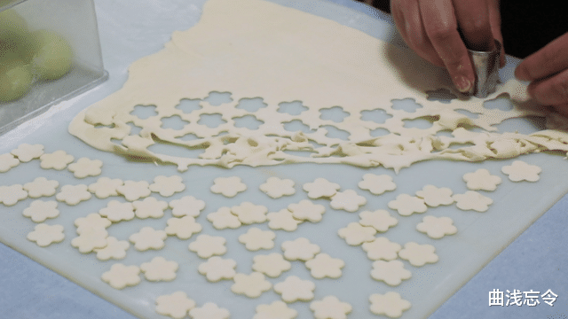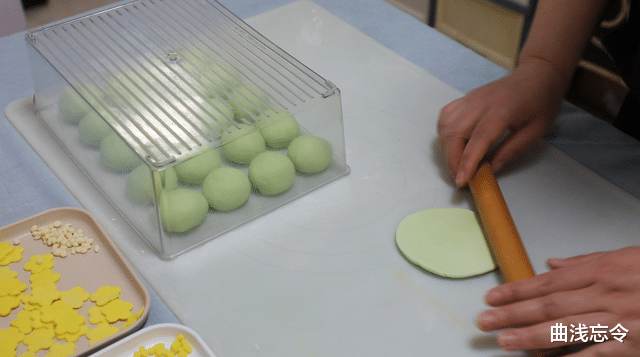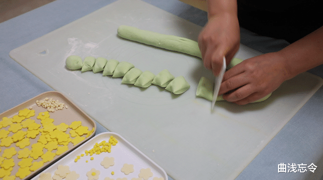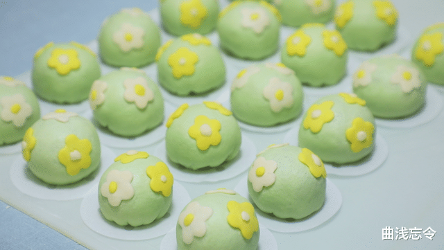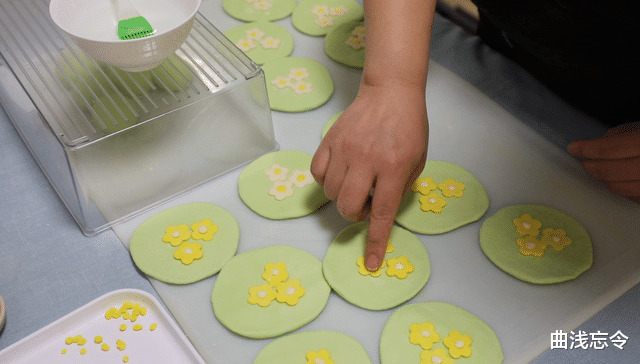 11、分切面团:绿色面团转移到揉面垫,充分揉搓排气,对半切开分成两次制作(一部分先盖纱布备用)。另一半揉搓成长条状,分切成约37g/个的小剂子,约21个。将绿色面剂子擀成包子皮,将花朵和花蕊刷点清水粘在包子皮上,稍微按压一下。