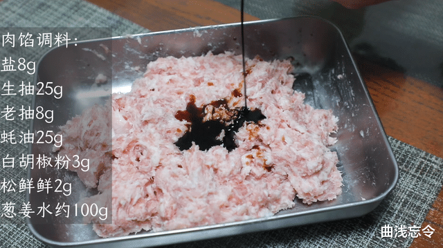 肉馅调料:盐8g、生抽25g、老抽8g、蚝油25g、白胡椒粉3g、松鲜鲜2g