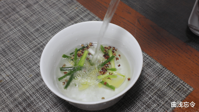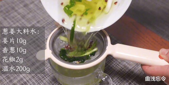 4、准备葱姜大料水:姜片葱段和花椒粒加入热水浸泡10分钟,抓揉出汁过滤放凉备用。