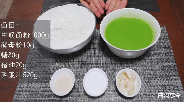 绿色面团:中筋面粉1000g、酵母粉10g、糖30g、猪油20g、荠菜汁520g(荠菜100g水500g)