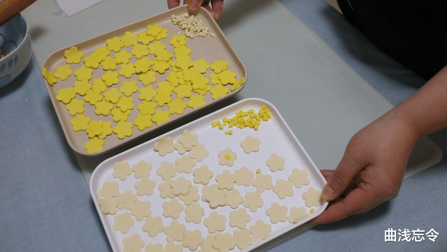 10、花朵装饰:白色面团擀成薄片,用花朵模具压出形状,撒适量干粉防粘。剩余的面团加黄色食用色素调成黄色,同样压出一些黄色花朵,另外再搓些小颗粒做花蕊。