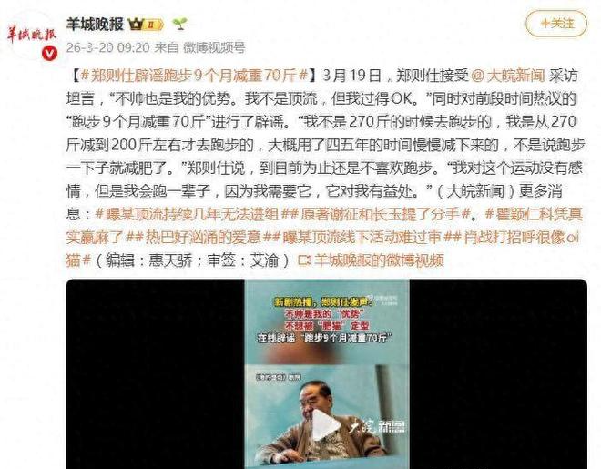 最近,一则关于“郑则仕跑步9个月减重70斤”的励志故事在网上疯传,成了不少减肥者的“强心针”。当事人亲自下场,一盆“冷水”把大家浇了个清醒——3月19日,郑则仕在采访中直接辟谣,坦言减肥没有神话,全是慢功夫。