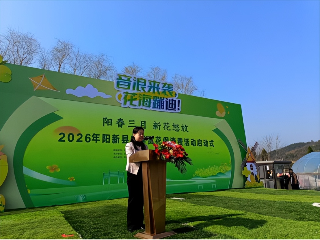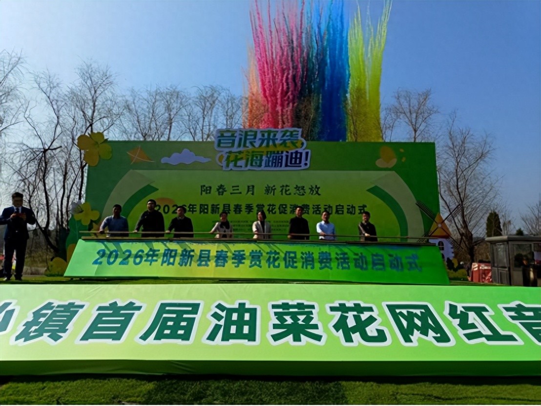 春和景明,繁花缀野,春风拂过鄂南阳新县枫林镇石田古驿生态旅游区,千亩油菜花竞相绽放,与蔬果小镇的田园风貌交相辉映,铺就成一片充满生机与希望的金色海洋。近日,“阳春三月 新花怒放”枫林蔬果小镇首届油菜花网红音乐节如期启幕,一场集文旅体验、消费赋能、民俗展示于一体的春日盛宴,在这片沃土上正式拉开帷幕,也同步开启了2026年阳新县春季赏花促消费活动的崭新篇章。阳新县政府副县长林子荣等领导亲临现场出席启动仪式,枫林镇党委书记马细芳发表致辞,与现场10000余名各界群众、游客共赴春日之约,共话乡村振兴的美好未来,共绘产业融合的发展蓝图。