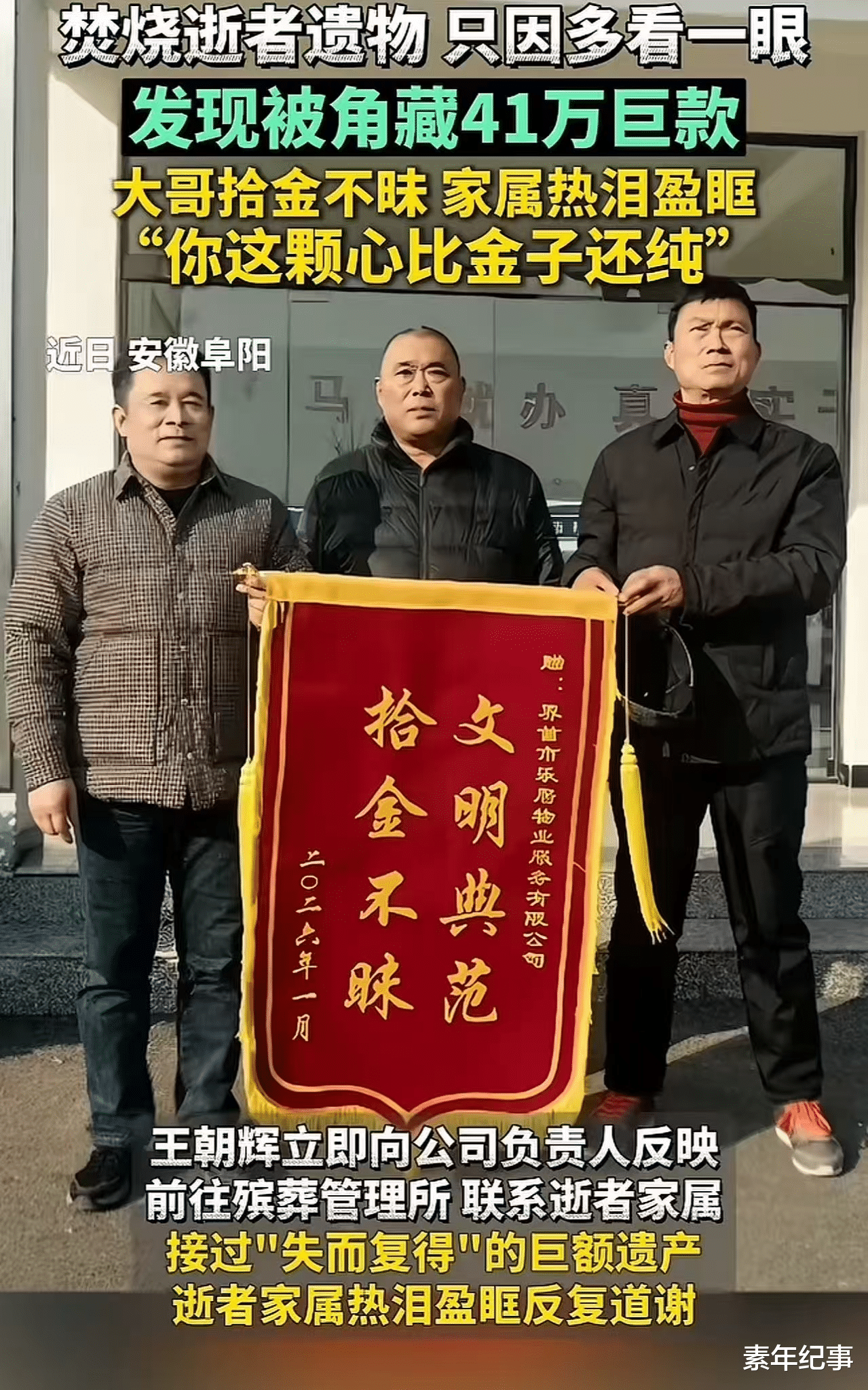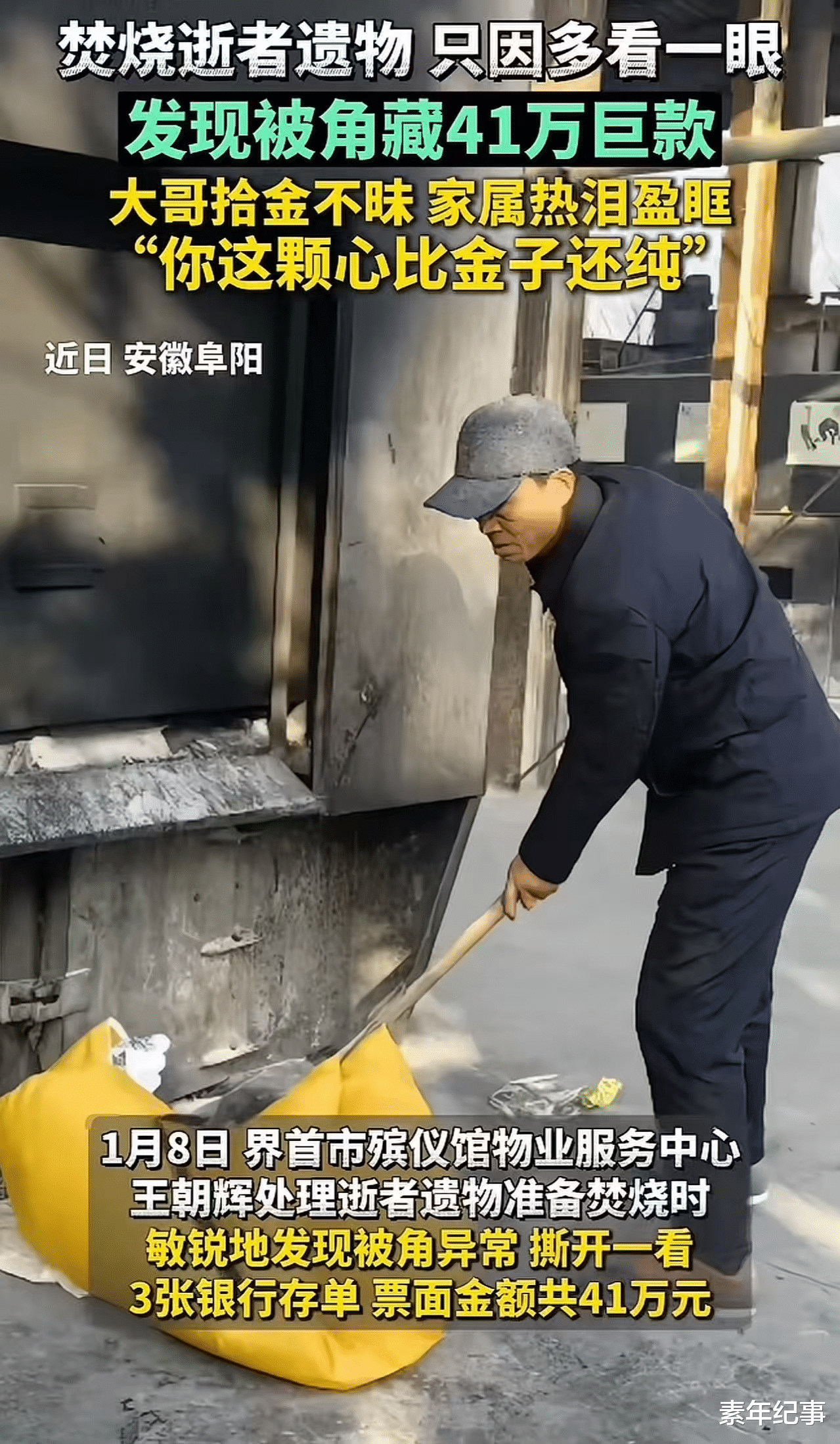 一床贴身旧棉被,藏着一位老人毕生的勤俭与牵挂。1 月 8 日,安徽界首市殡仪馆内,物业员工王朝辉的一个细心举动,挽回了 41 万元存款,也留住了逝者留给家人的最后念想 —— 这床差点被火化的被子里,竟缝着三张合计 41 万的银行存单。