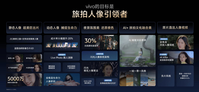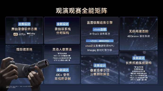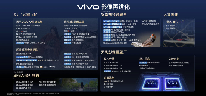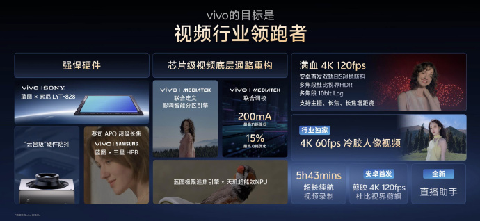 再往下说,是天玑9500。这颗芯片的意义,不是性能跑分,而是 vivo 和联发科三年共研,将蓝图影像芯片V3+ 与天玑9500 SoC 双芯合体,让能效与性能大幅提升,带来诸多领先影像功能。这套组合带来了安卓独家的 4K 60fps冷胶人像视频,不只是拍得更清,更是手机直出就能用,大幅拉低了视频创作门槛,全流程都在手机上闭环完成,这对内容创作者来说,是直接提升效率的重武器。