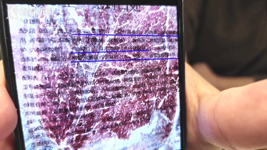 而在新世界店,一位店员则坦言:“是合成的,就是牛肉打碎之后跟其他的料合成。”