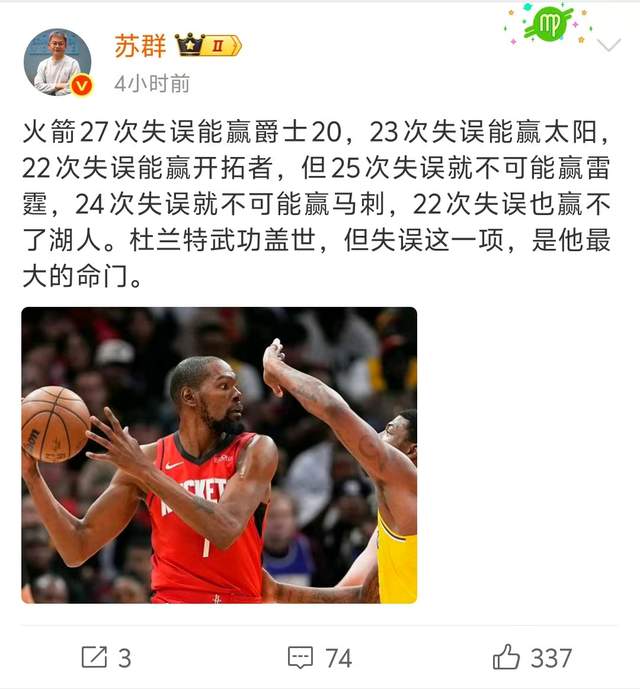 赛后,苏群老师在社交平台上说了一段话。他说,火箭这支队伍,你要是失误27次,你能赢爵士20分;失误23次,你能赢太阳;失误22次,你还能赢开拓者。