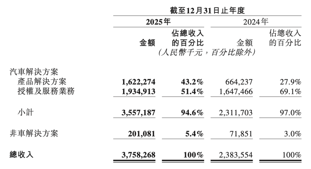 财报中的收入结构变化也印证了这一转向。2025年,地平线产品及解决方案收入16.22亿元,同比大增144.2%,占总营收比重从2024年的27.9%提升至43.2%;授权及服务业务收入19.35亿元,同比增长17.4%,占比51.4%。两大业务板块形成了相对均衡的收入结构,增强了抗风险能力。