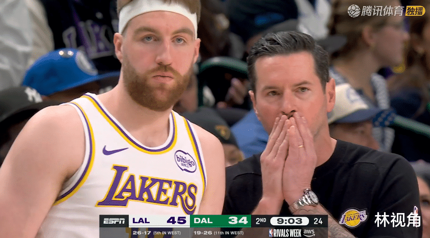 两队连续打平,虽然领先没了,但湖人至少稳住了,这一节还有3分多钟,老詹换下东契奇。