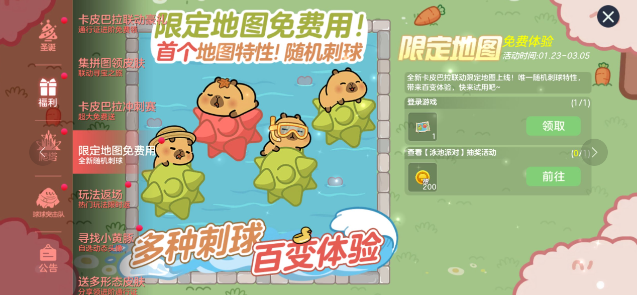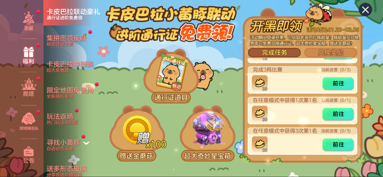 另外小黄豚联动征集活动开启了,1月23日-2月23日带#球球大作战卡皮巴拉联动 、#这球稳了 2个话题在抖音、快手、微博、小红书平台发布联动相关原创内容,即有机会获得京东卡、2000金蘑菇、she哩哩、塔坦挎包...等实物周边奖励!