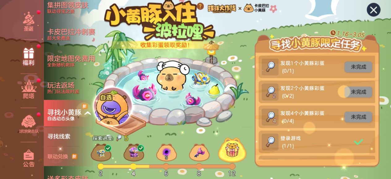 这个活动16号就开启了,没有完成的抓紧了,启航珍宝箱、超大奇妙星钥匙、波拉哩黑洞、超大钥匙、小黄头联动头像以及小黄豚橘子(23日登录可兑换超大种子,最高可得12把超大钥匙),那么4个彩蛋在哪呢?