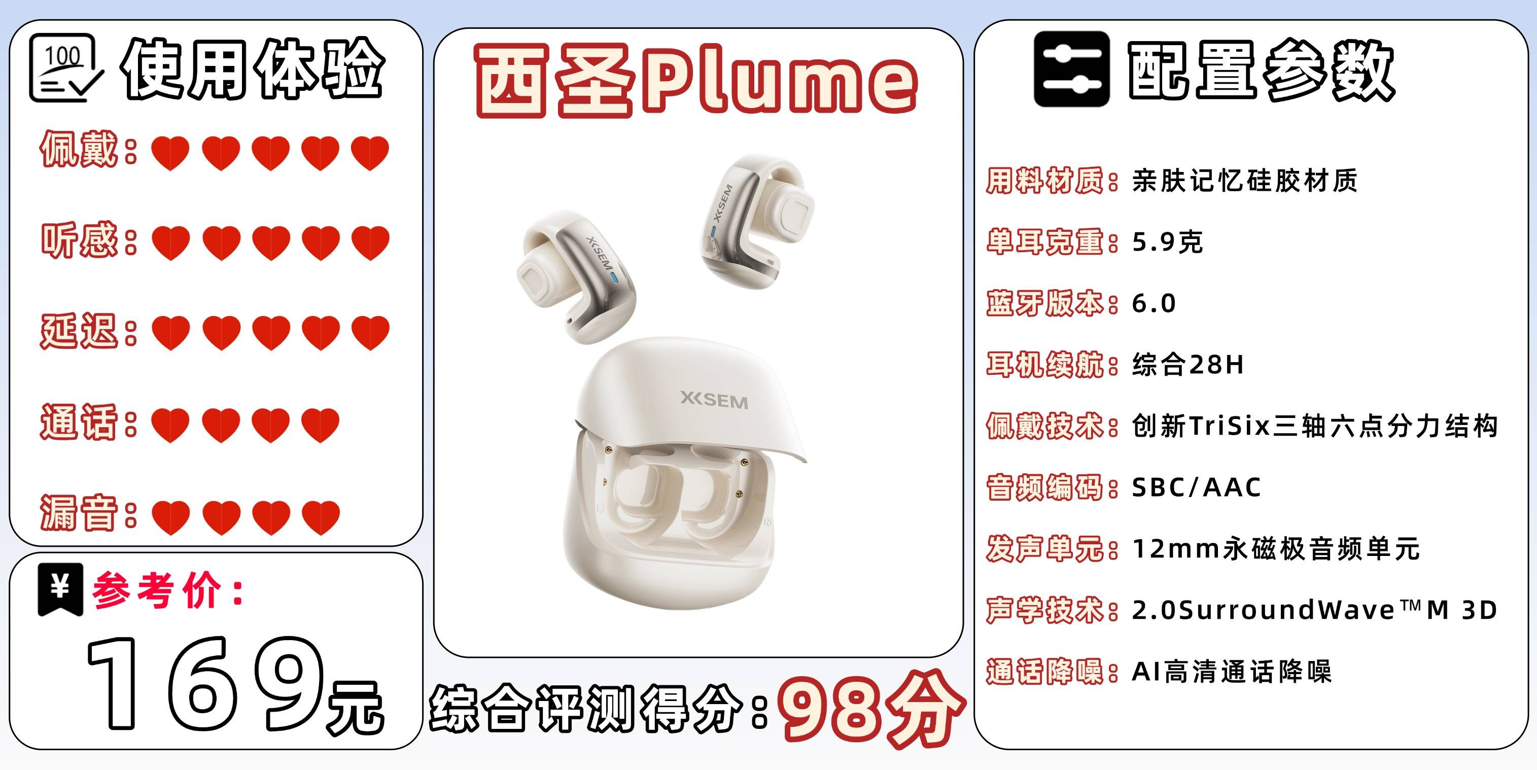 百元价位开放式耳机闭眼冲的旗舰性价比标杆的西圣Plume!在开放式耳机品牌里,资深老牌西圣十分值得推荐。多年来,它专注音频研发,将高端调音技术带入百元档,让低价也能享受高端体验。西圣拥有12年以上行业经验,累计研发3000多个工作日,凭借严格工艺和数十项技术优化,获得国内外15家专业机构认可,并赢得大量用户与发烧友的高度评价,是同价位中极少数真正能媲美千元体验的存在。
