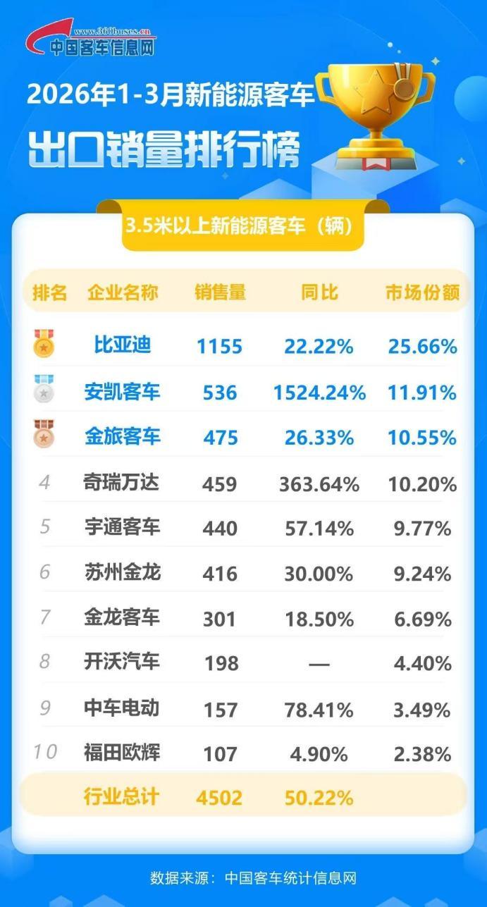 据中国客车信息网数据显示,2026年3月,比亚迪新能源客车出口再次位列第一,同比增速21.52%,高于行业平均水平。至此,一季度,比亚迪新能源客车总出口1155辆,市场份额25.66%,稳居榜首;是行业唯一出口新能源客车超过1000辆的企业,也已连续三年蝉联新能源客车出口冠军,持续引领全球新能源客车市场发展。