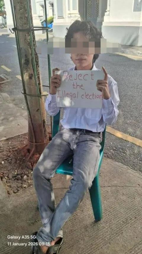 据悉,这名年轻人于1月11日上午9点,在军方举行第二部分选举期间,手持“拒绝非法选举”的标语进行抗议。