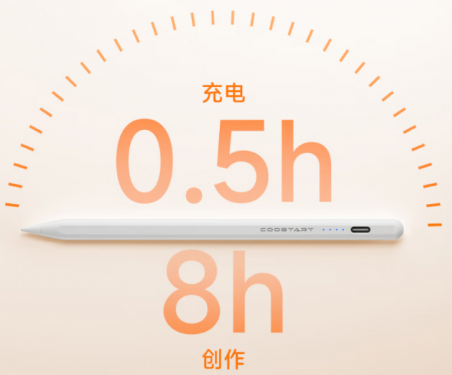 这款电容笔非常符合日常使用习惯。笔身采用哑光处理,手感细腻顺滑,而且重量约为13.5克,拿在手里既轻巧又有一定质感,长时间书写也不会感到疲劳。并且它的笔尖采用POM材质,兼具耐磨性和顺滑度,落笔自然流畅,没有明显阻滞感。加上倾斜压感功能,不论是随手记录笔记还是简单绘画,都能呈现出线条的丰富层次与细腻变化。在其他方面上,它的笔身内置电量指示灯,可直观显示剩余电量,方便及时充电。而且充电接口为主流Type-C接口,兼容性良好。续航表现上,支持约11小时的连续使用,基本能够满足一天的学习或办公需求。不过在高强度使用下,电量消耗相对较快。