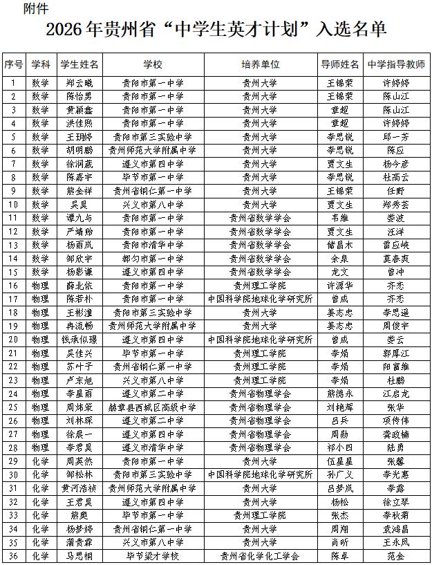 近日,2026年贵州省“中学生英才计划”入选名单公布,一起来看——
