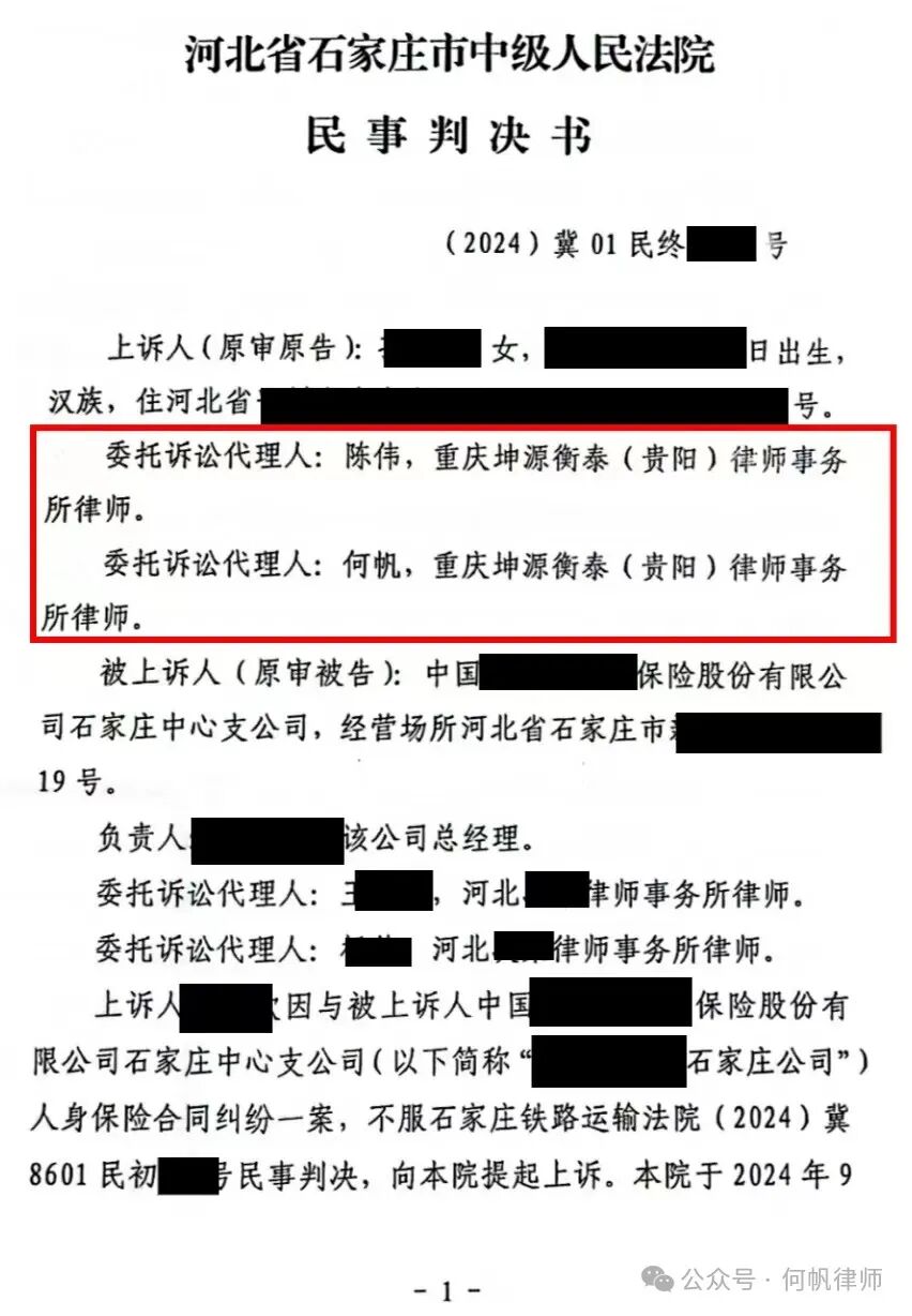 在石家庄发生的一起保险理赔纠纷案件中,当事人在被确诊为 CIN2 后,依据多份保险合同向保险公司提出理赔申请,却遭到保险公司以 CIN2 不属于原位癌为由的拒赔。当事人在困境中寻求到陈伟、何帆两位律师的专业帮助,委托他们代理此案。案件一审结果不尽人意,当事人遭遇败诉,但并未气馁,在两位律师的坚定支持下决定继续上诉。