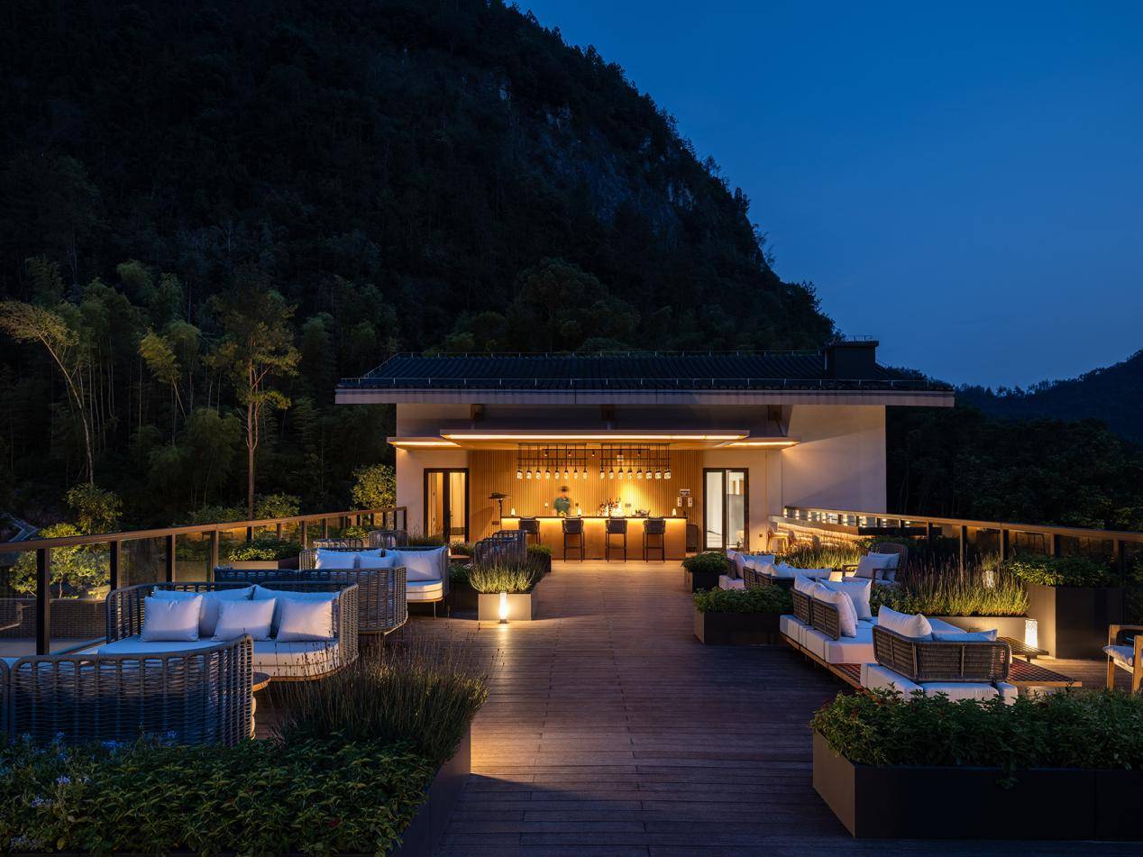 青山为幕,溪声为伴。傍晚时分,于此小聚,举杯聆听自然与冰块的轻碰,惬意非常。