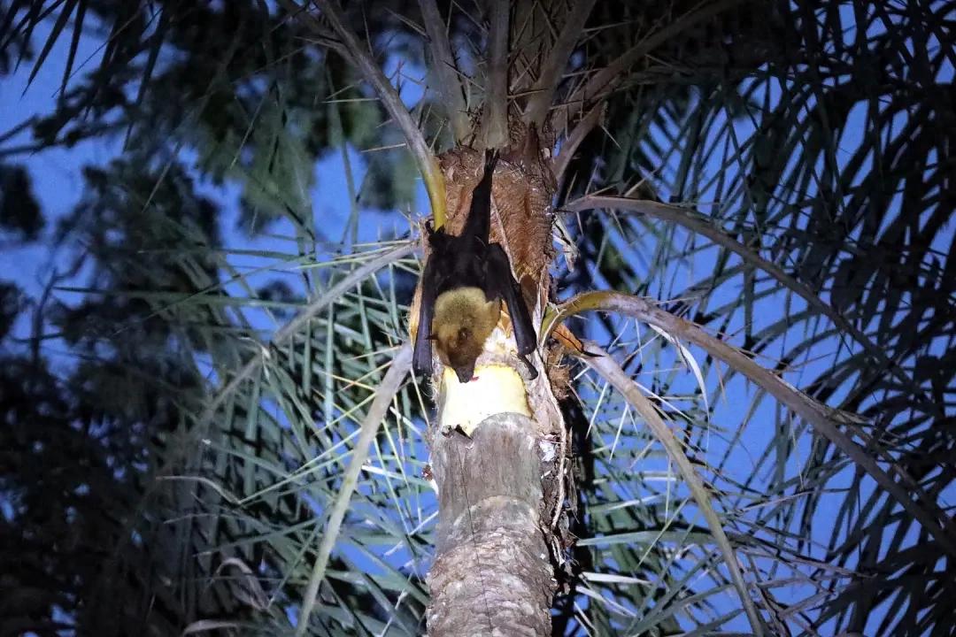 一只蝙蝠在树上喝生枣椰汁 图据视觉中国
