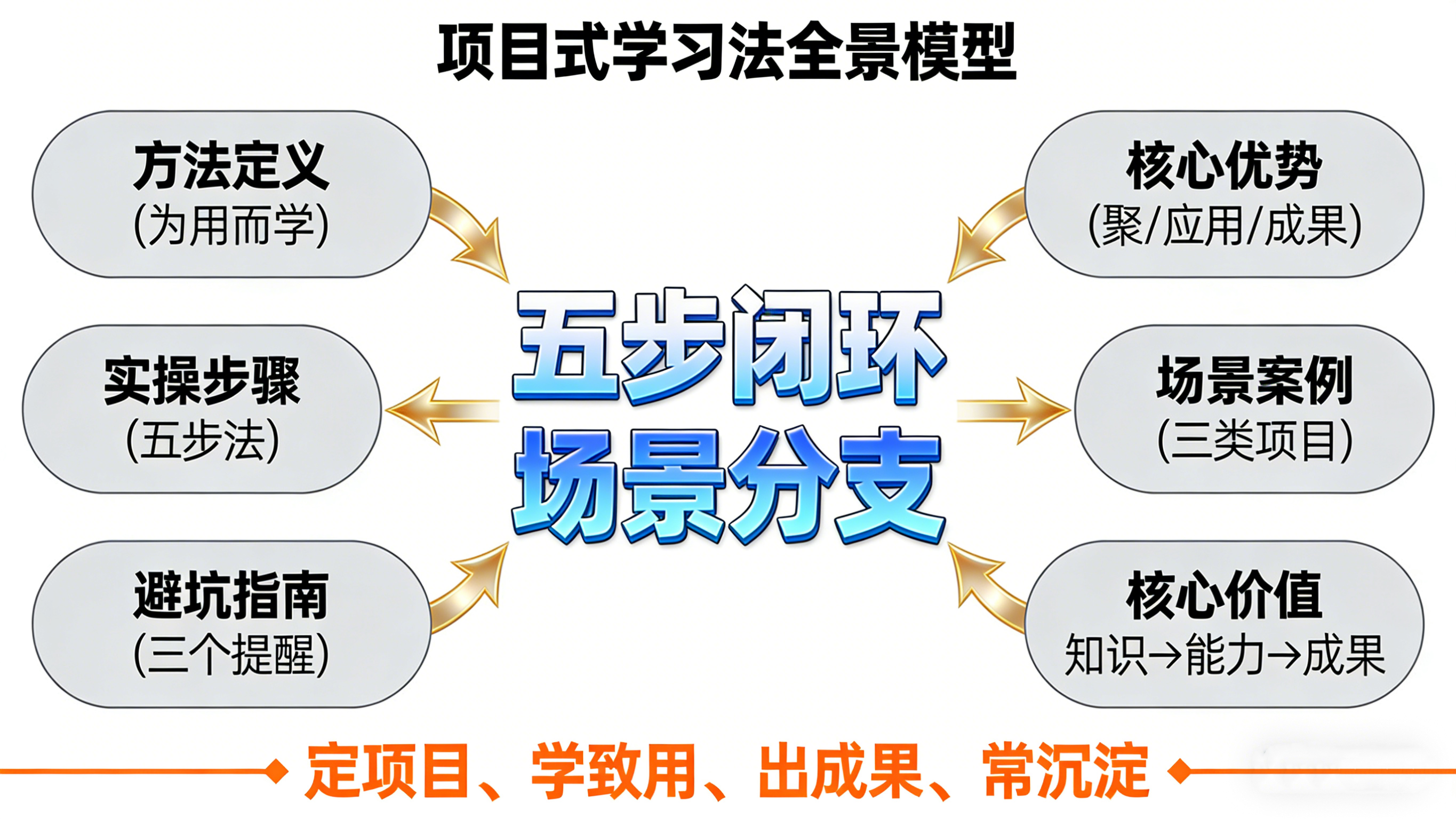 第五步:总结沉淀,形成知识体系(沉+积)项目完成后,及时总结沉淀,把项目中用到的知识、技能、方法整理成体系,为后续同类项目积累经验,让能力持续提升。
