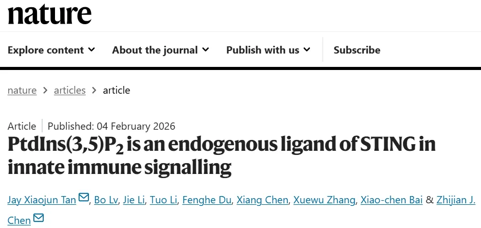 [1]Tan JX, Lv B, Li J, et al. PtdIns(3,5)P2 is an endogenous ligand of STING in innate immune signalling[J]. Nature, 2026. DOI: 10.1038/s41586-025-10084-0. Epub ahead of print.