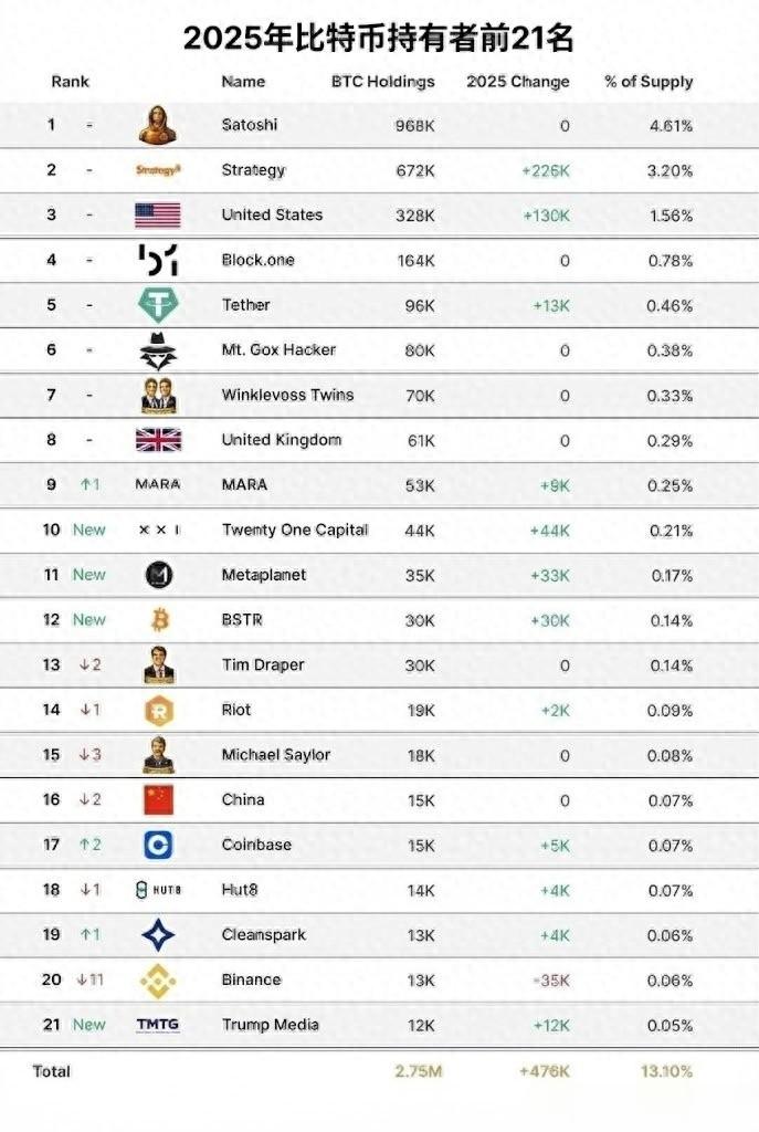 - 机构:排在第二的"Strategy"在2025年增持了22.6万枚BTC,是所有名单中增持最多的。