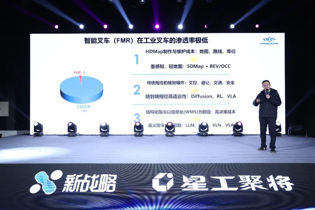 核心内容:在本次演讲中,陶熠昆从三个维度阐述了智能工业车辆产品与技术范式跃迁,提出从传统AMR向具身智能移动机器人(EIMR)演进的路径与可行性。他首先指出当前智能叉车(FMR)在工业叉车的渗透率极低,高精地图制作与规控规则爆炸制约落地,而智驾技术栈的迁移为此带来转机——通过引入BEV/OCC感知范式为“轻图”提供技术底座,并结合语义SLAM解决数据效率问题,为工业车辆轻量化落地提供技术底座。这一跃迁的核心是群体(系统)智能到单机(分布)智能,以数据驱动推动AMR的进化,最终实现人工级作业效率。