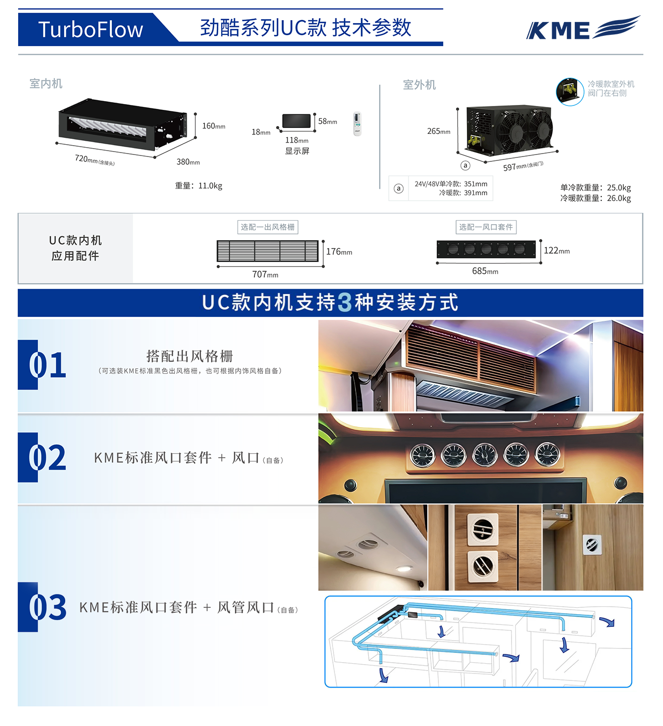 KMETurboFlow劲酷系列UC款空调的内机采用的是内机整机嵌入式安装设计,凭借多样化的安装方式,能让设备与车内环境自然融合,灵活适配各种内饰风格。