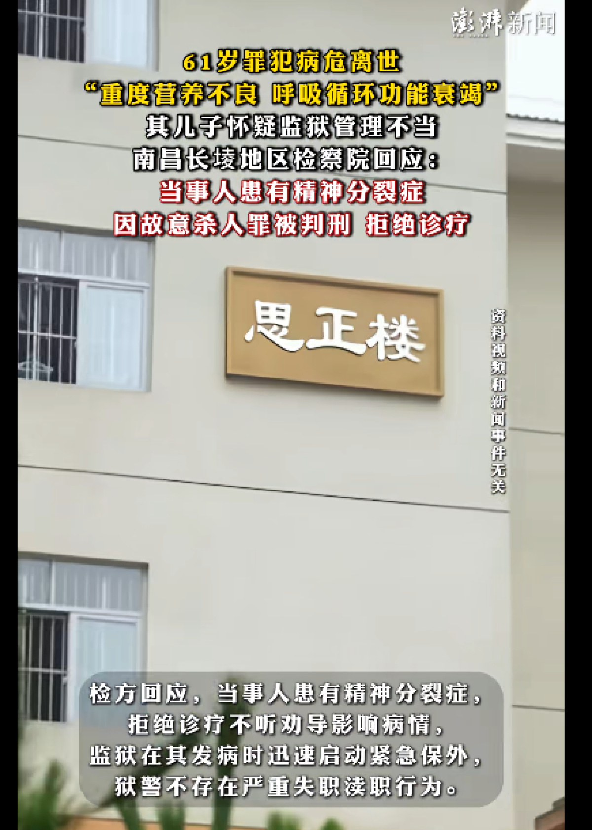 男子称61岁母亲服刑期间病危离世,官方回应:当事人患有精神分裂症拒绝诊疗,因故意杀人罪被判刑,狱警不存在严重失职渎职行为