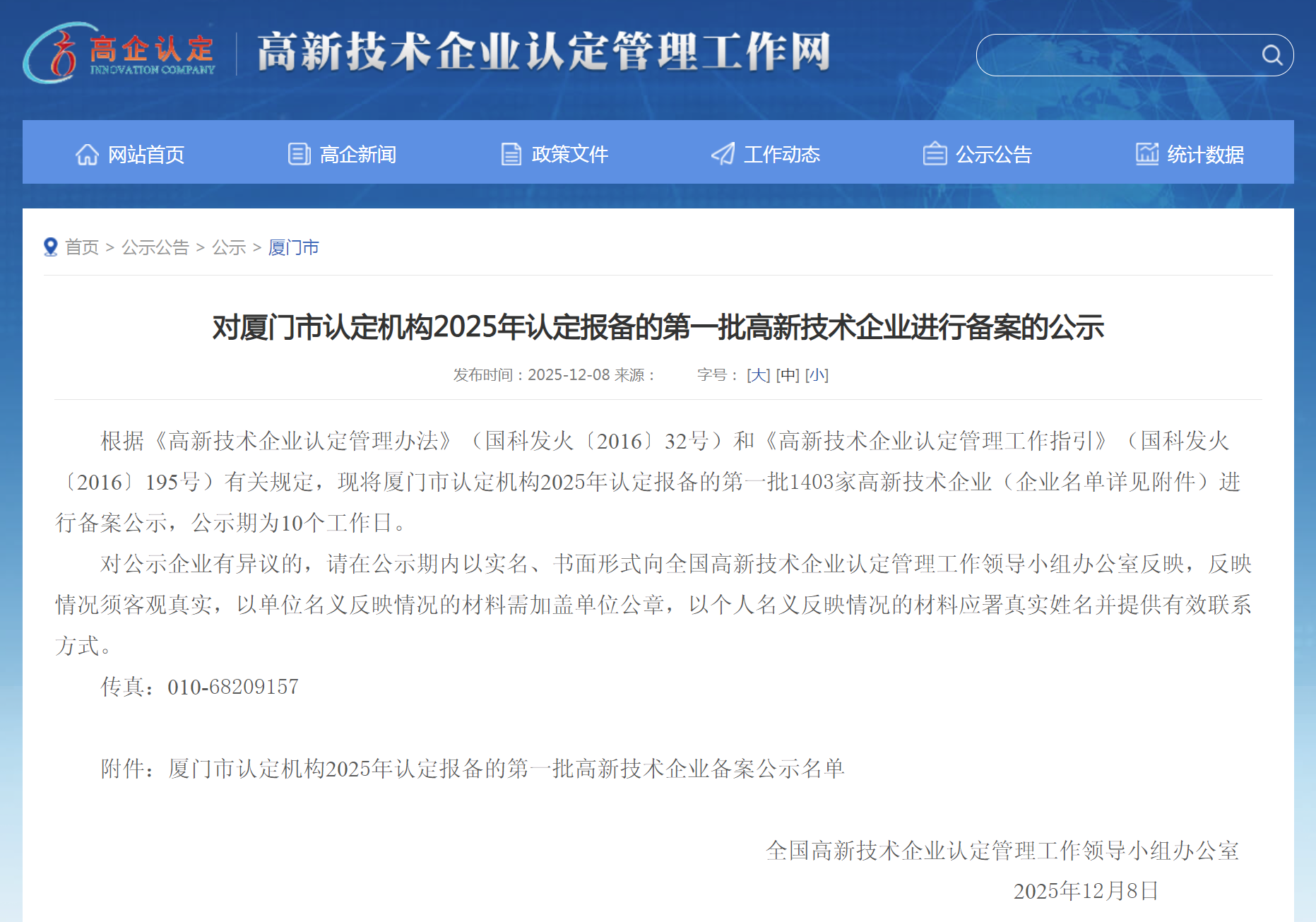 12月8日,全国高新技术企业认定管理工作领导小组办公室发布公告,对厦门市认定机构2025年认定报备的第一批高新技术企业进行备案公示。易点生活电子商务有限公司旗下专注技术创新的易点生活数字科技有限公司凭借持续的研发投入与卓越的科技创新能力,成功入选该名单,再次获评为国家级高新技术企业。这标志着公司在数字化营销领域的自主研发实力与技术服务能力获得了国家层面的权威认可。