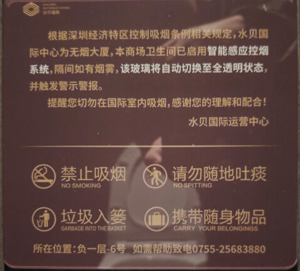 在罗湖区水贝国际中心负一楼的男厕所里,确实能看到其中一个隔间有点不一样。旁边的墙上贴了张醒目的提示牌,上面写着:“吸烟将使玻璃变透明!可别没忍住被拍变成网红了”,旁边还配了个有点无奈的“社死”表情包。